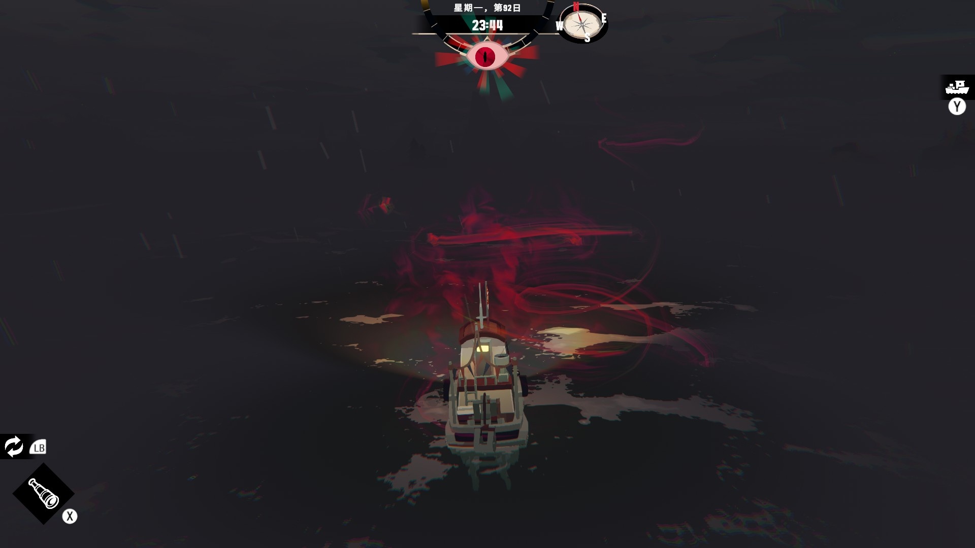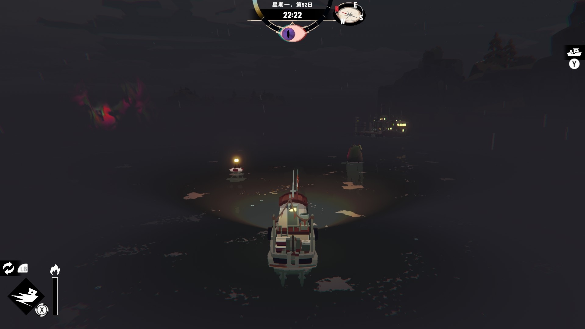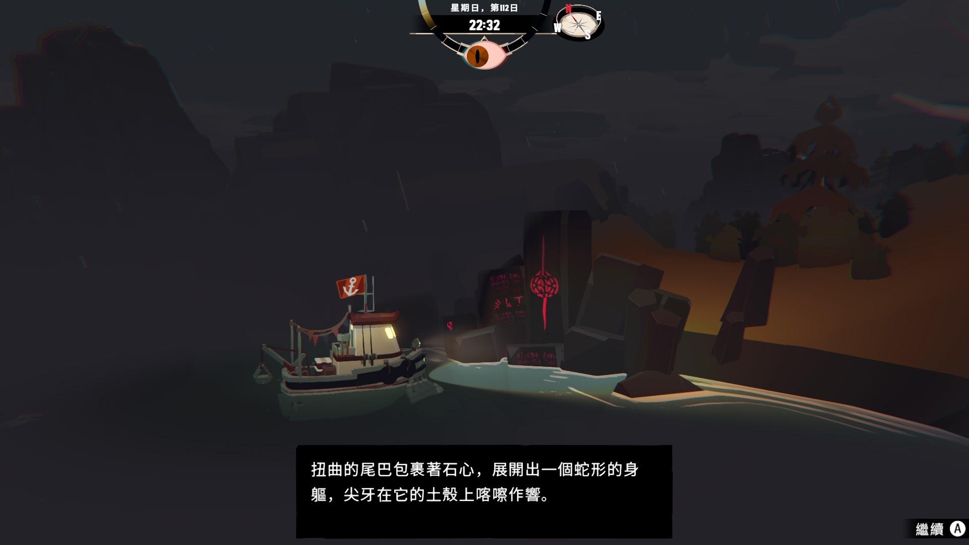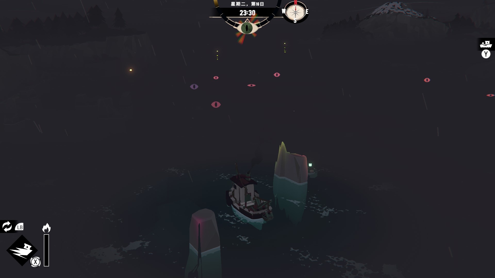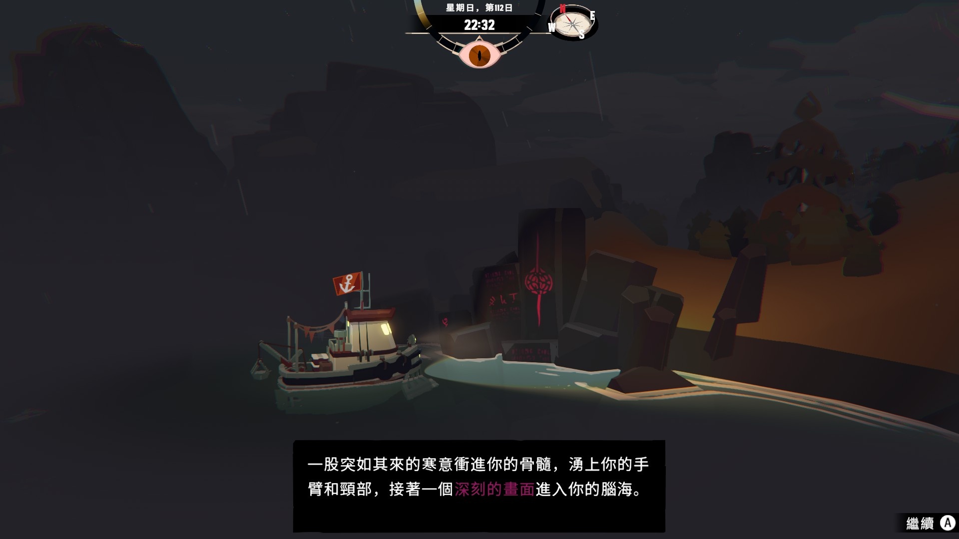 然後一旦入夜,整片海域都會開始浮現異常,莫名的迷霧、詭異的低語、忽然冒出的礁石,潛伏的詭異威脅逐漸浮出海面,遠方的漁船正對你鳴笛,那究竟是友善的同行,亦或是......?
