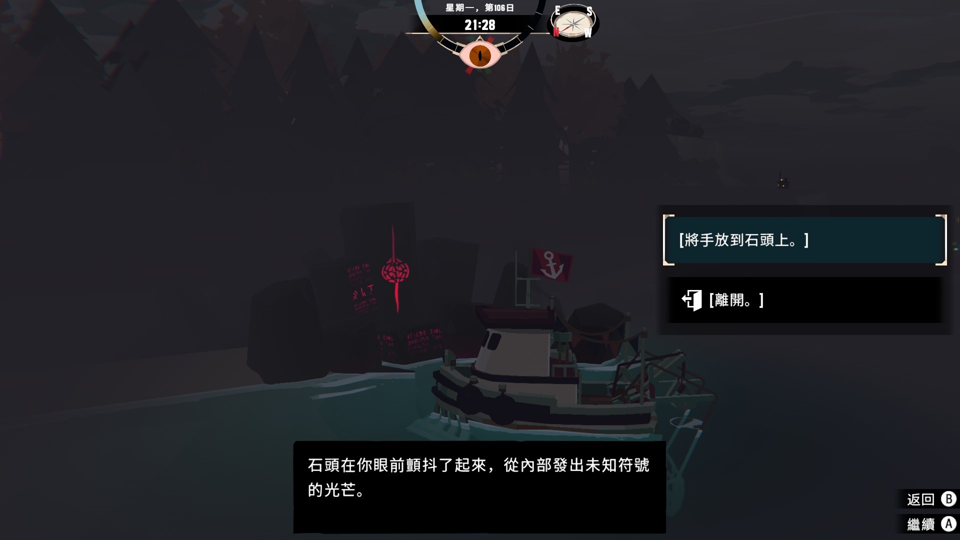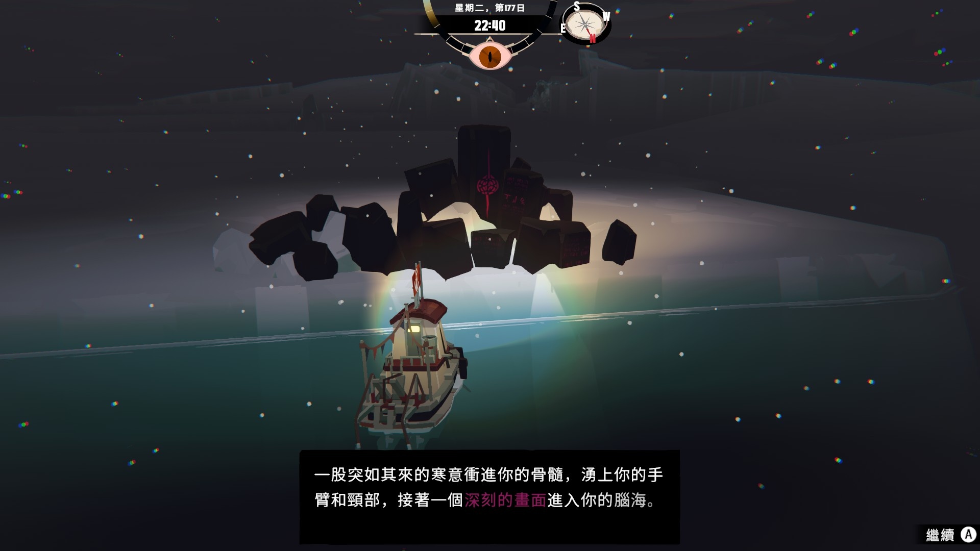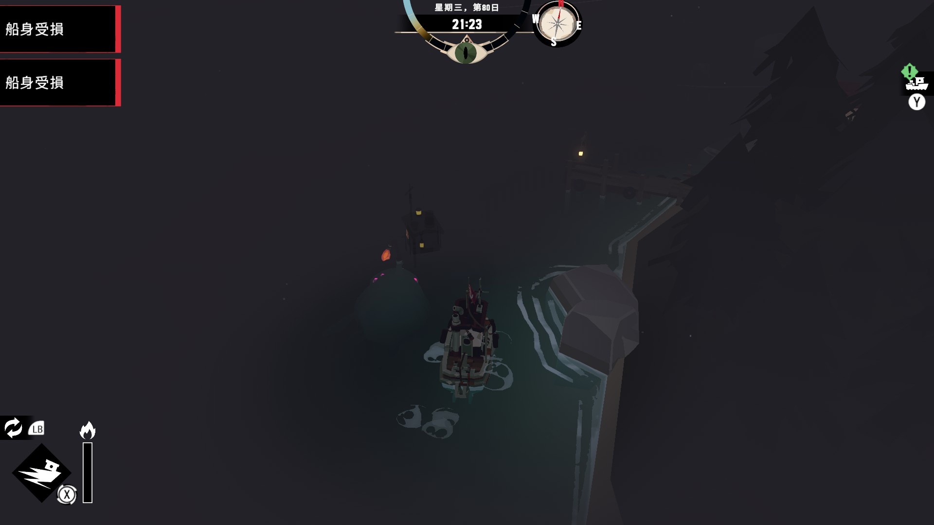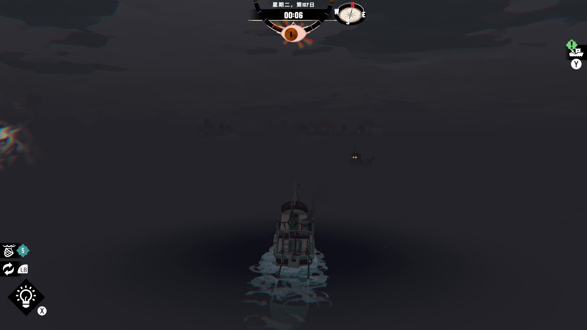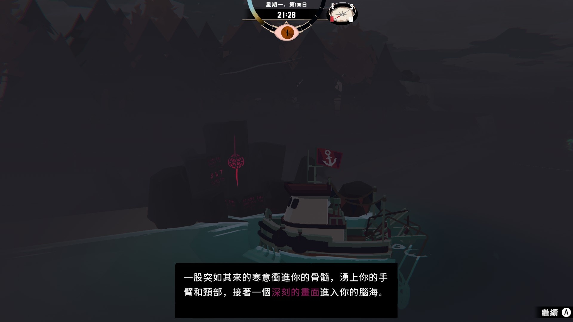 然後一旦入夜,整片海域都會開始浮現異常,莫名的迷霧、詭異的低語、忽然冒出的礁石,潛伏的詭異威脅逐漸浮出海面,遠方的漁船正對你鳴笛,那究竟是友善的同行,亦或是......?
