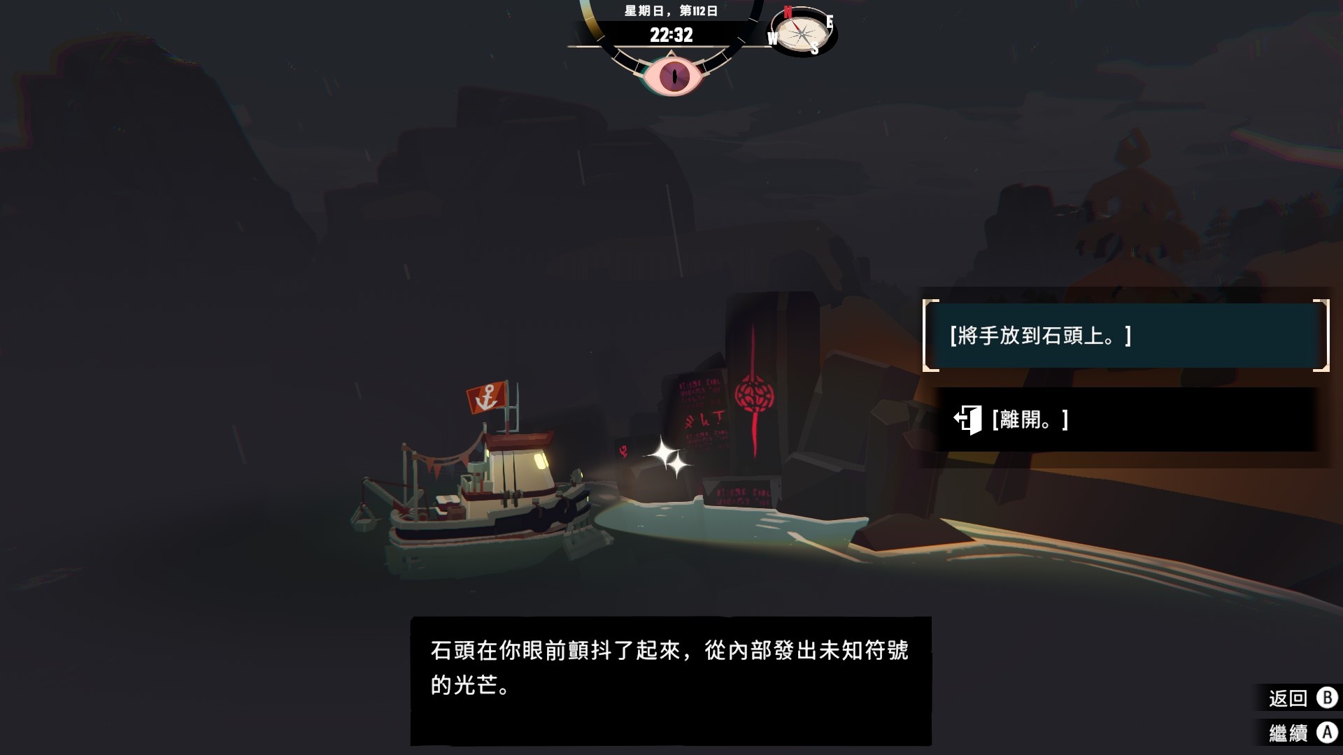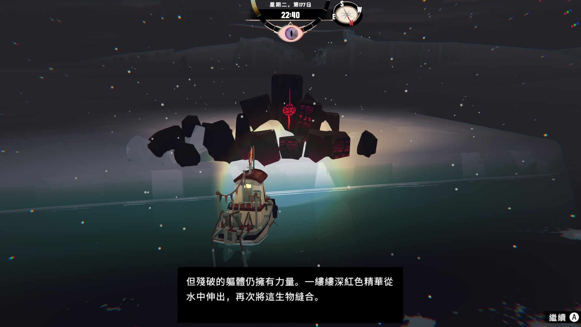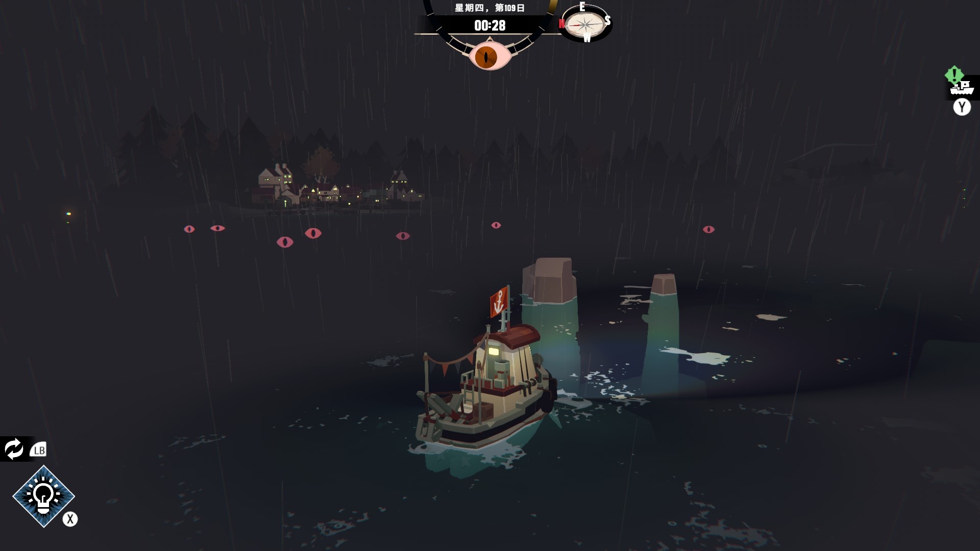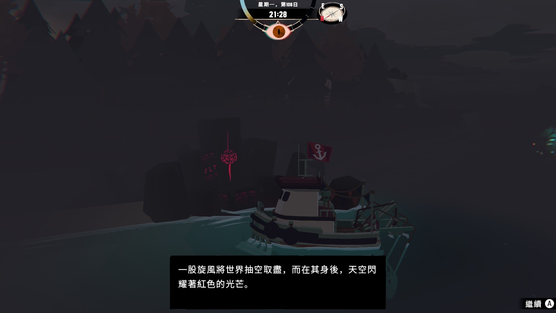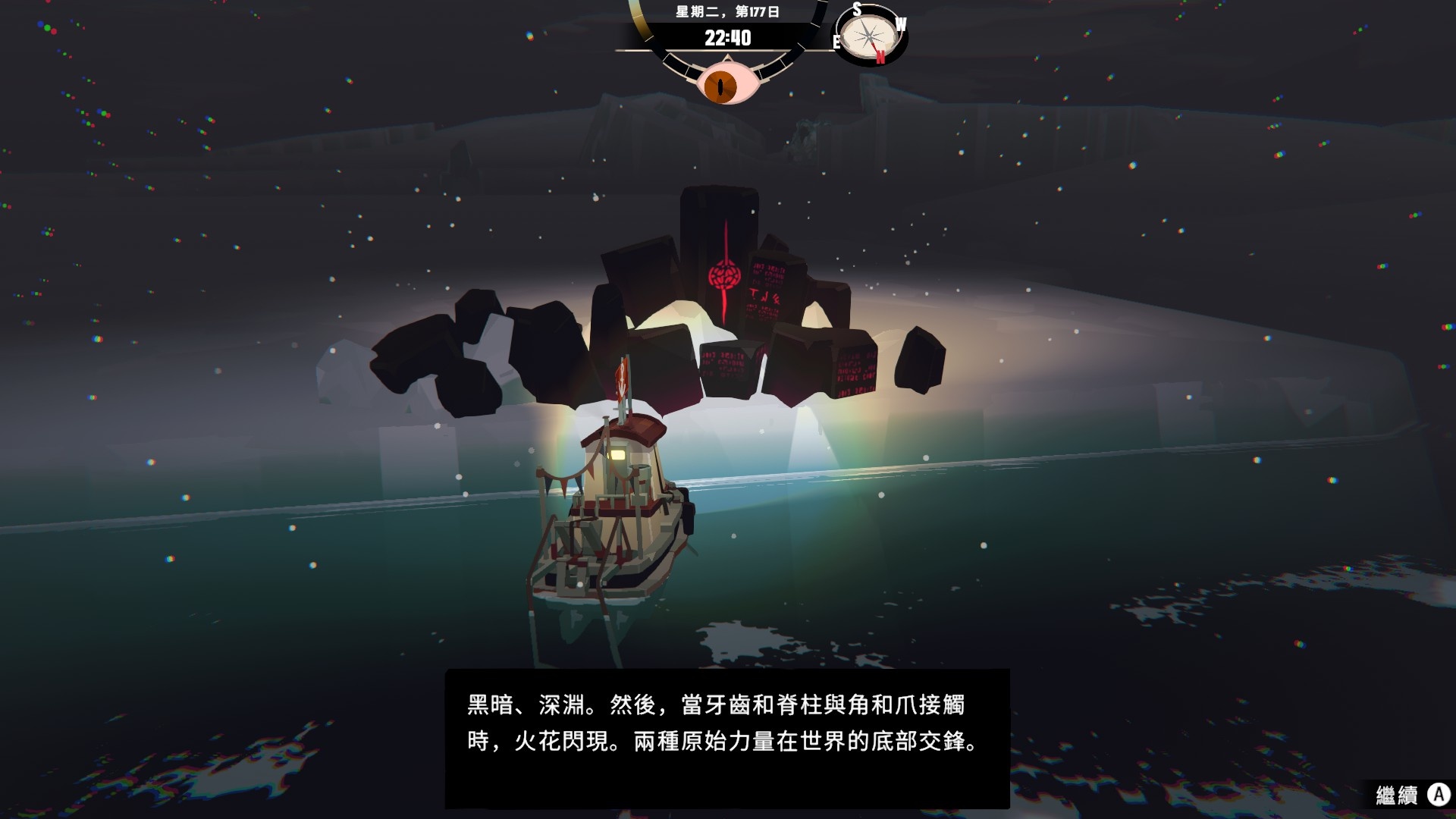 然後一旦入夜,整片海域都會開始浮現異常,莫名的迷霧、詭異的低語、忽然冒出的礁石,潛伏的詭異威脅逐漸浮出海面,遠方的漁船正對你鳴笛,那究竟是友善的同行,亦或是......?