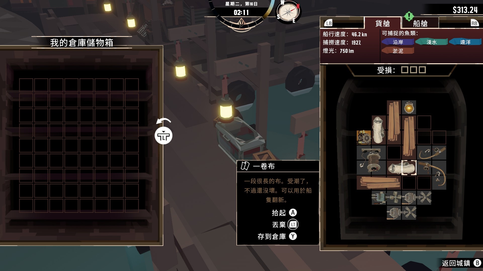 基本玩法很容易上手,航行到魚群上方就可以開始釣魚小遊戲,釣到的魚會直接進船艙,可以透過旋轉或移動各式物品,盡可能把漁獲塞滿整船,可以換取更多金錢。