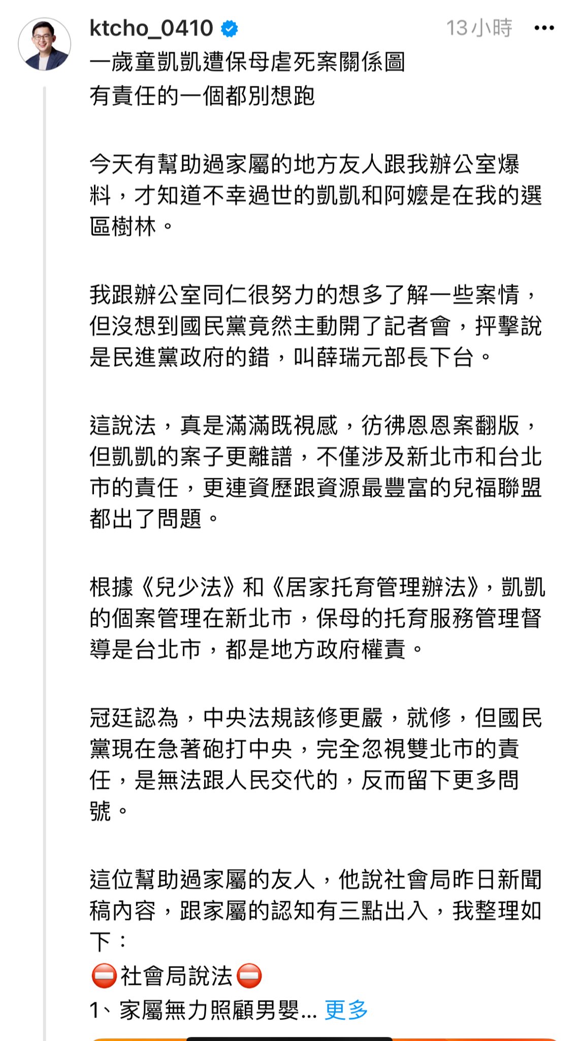 『冠廷針對虐兒案的疑點影片直播。每個小孩都是家屬的心頭肉,阿嬤其實並沒有想要出養剴剴,她只是希望能申請一些補助能夠有政府幫忙照顧剴剴,新北市府卻把剴剴當球一樣踢給兒福。新北市府還在狡辯沒責任。🤬🤬🤬🤬🤬🤬』