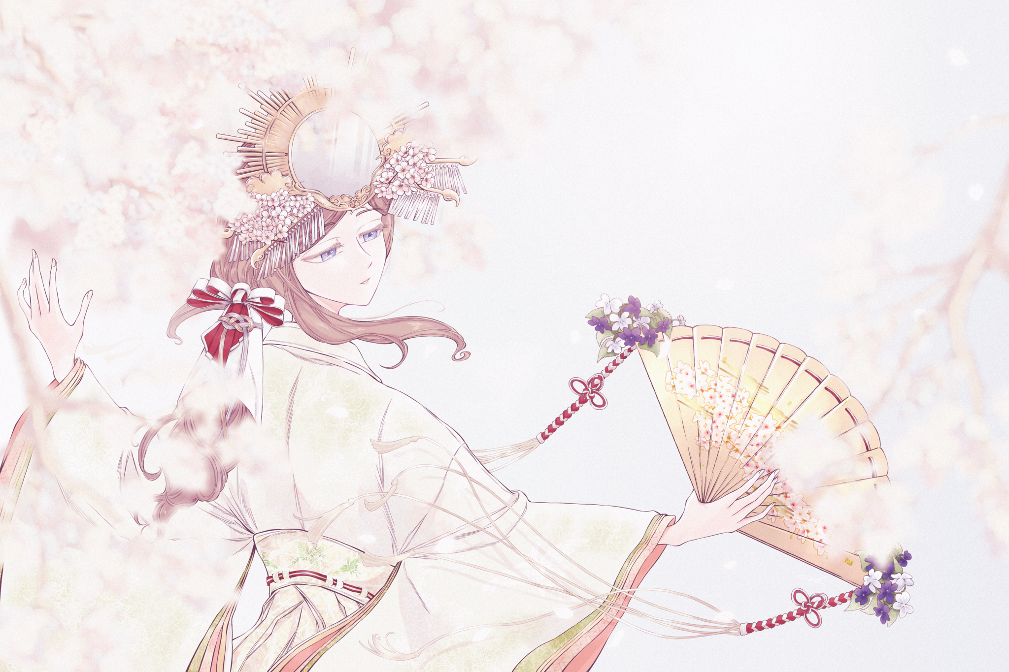 觸及太刀之際,一朵白櫻登時化作一簇,紛紛然怒放。太刀刀身陡然煥發無可逼視的森冷光芒,開至極盛的花簇亦隨之綻裂。室內櫻花零落如雨,而待櫻雨落盡,一名衣著華麗的青年已然端坐於刀架之後。青年緩緩抬頭、睜眼,金瞳一如初昇之朝陽,溫暖而明亮。