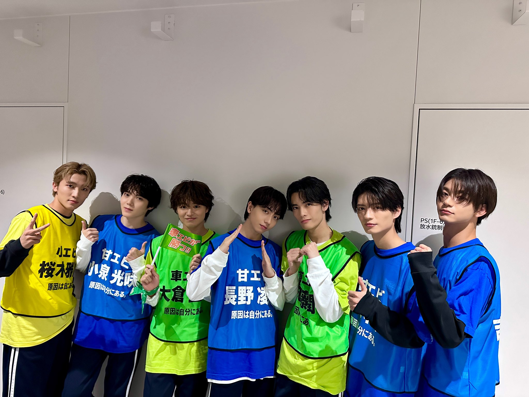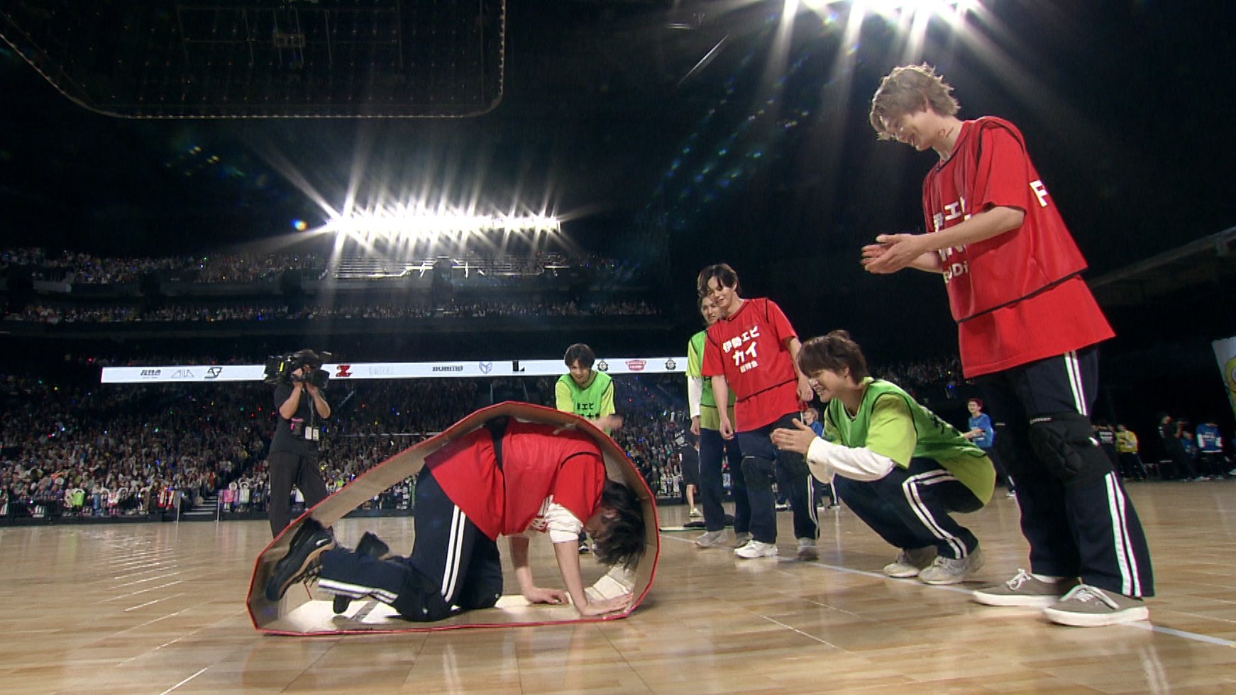 まさや接力差點從最後?追到變第一名的時候跌倒 然後哭ㄌ的時候有感覺到身邊有人圍過來 預想會看到黃色的小エビメンバー 結果張開眼睛看到很多不同顏色 結果是げんじぶメンバー圍過去