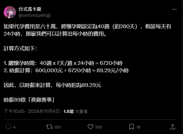 第一、人家衛福部的一百萬,是包括代孕機構的醫生、律師、保險公司的,林林總總的加起來一百萬。