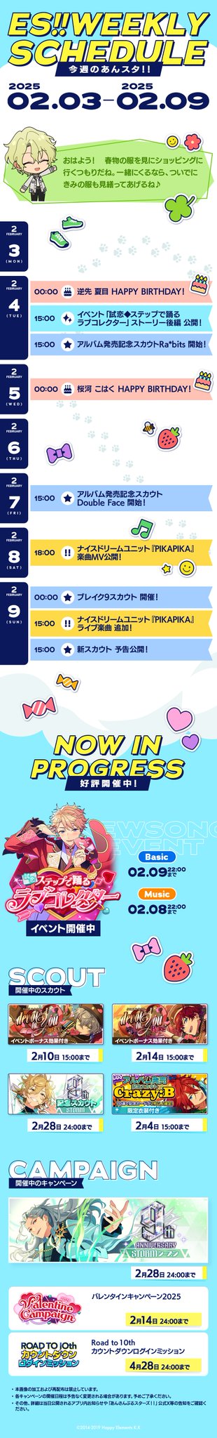 然後劇情時間點在這 根據接下去是上次燐音那池來判斷 那池提到雷歐剛過生日(還是過幾天就 生日) 表示這次劇情是在四月下旬五月上旬 但應該不是2月(兔兔活動在四月) 而且根據預告應該已畢業或者即將畢業
