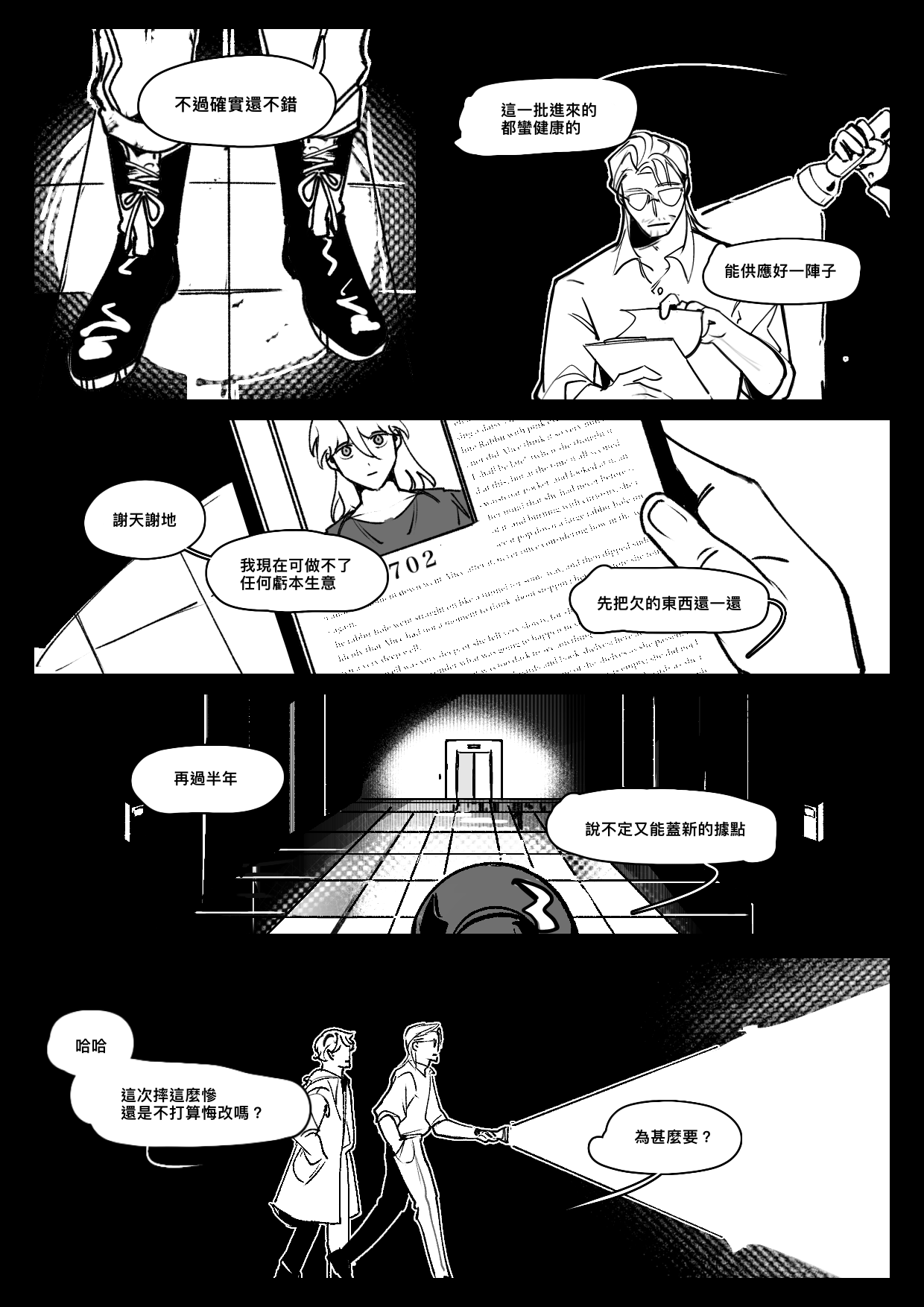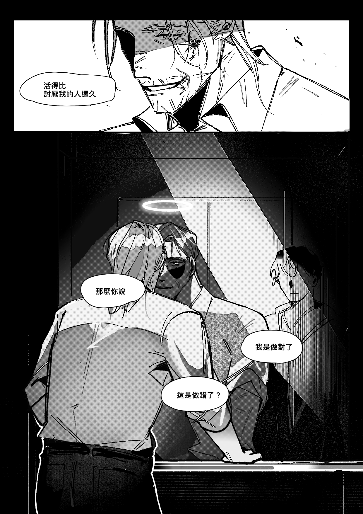 你好瘋你畫太多了我永遠喜歡你的運鏡……販賣小孩有夠變態但我喜歡看耶,台詞搭配光環那張超有力道,喜歡他站在暗處跟他的立場一樣黑……還不知道會發生什麼事但先心疼小侄,叔叔是他今晚的惡魔貓男嗎(???)