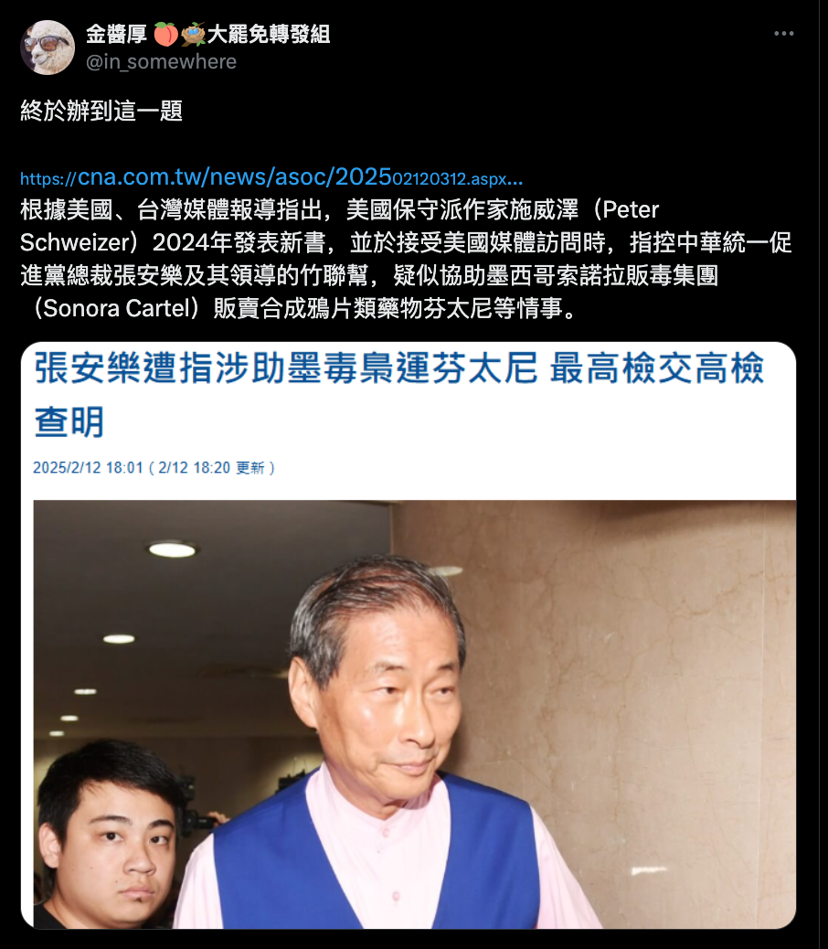 張安樂疑助墨西哥毒梟運芬太尼 最高檢交高檢查明 | 社會 | 中央社 CNA