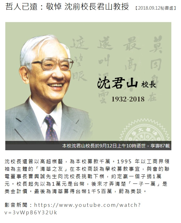 哲人已遠:敬悼 沈前校長君山教授【2018.09.12秘書處】-首頁故事:國立清華大學