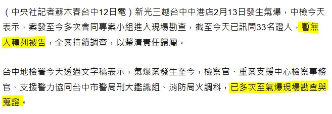 台中新光三越氣爆案 中檢已訊問33名證人 | 社會 | 中央社 CNA