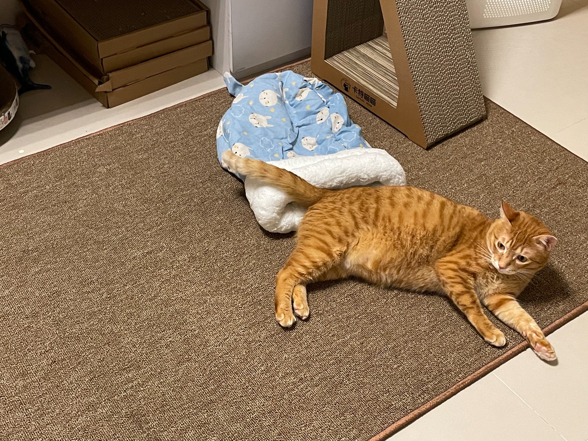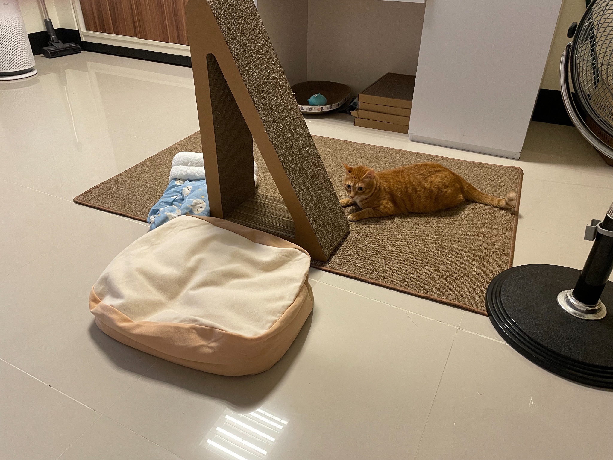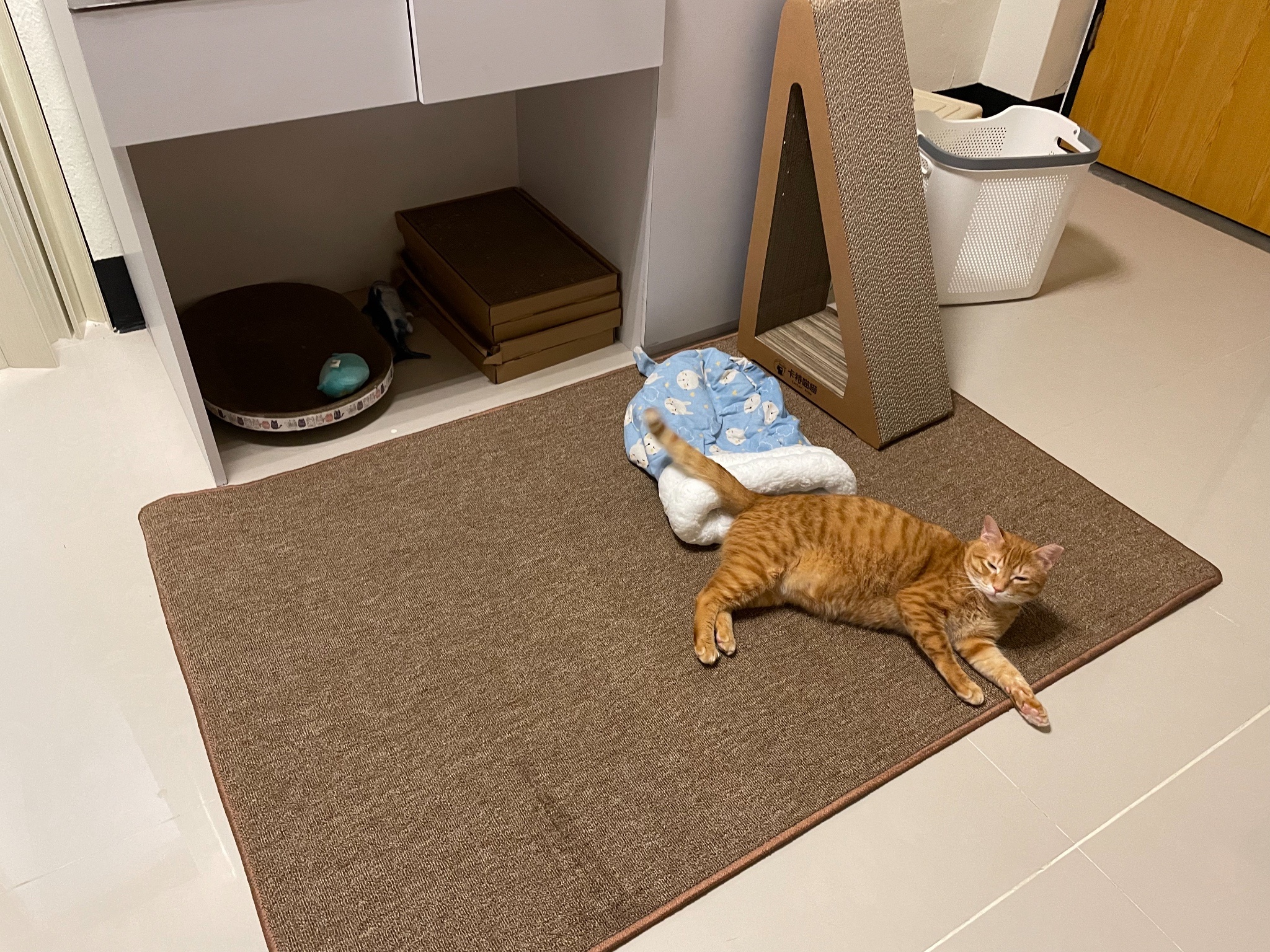 地板都是瓷磚的就買了個貓抓地毯跟貓砂墊給他