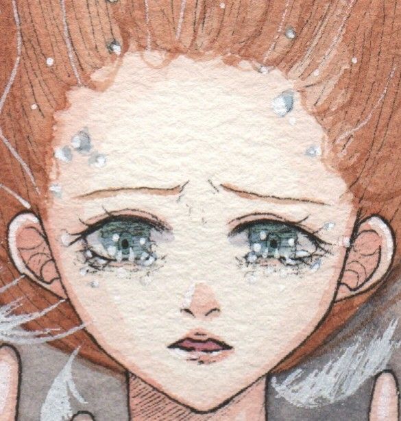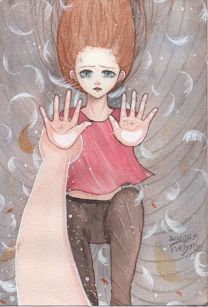 畫中的她,眼神迷惘、身體懸浮於混沌之中,周圍飄散的羽毛像是破碎的希望。但她伸出雙手,彷彿還願意相信,那一線希望仍存在。那來自畫面下方的手,是愛的象徵,是神的應許:「我在這裡,我不會讓你掉下去。」