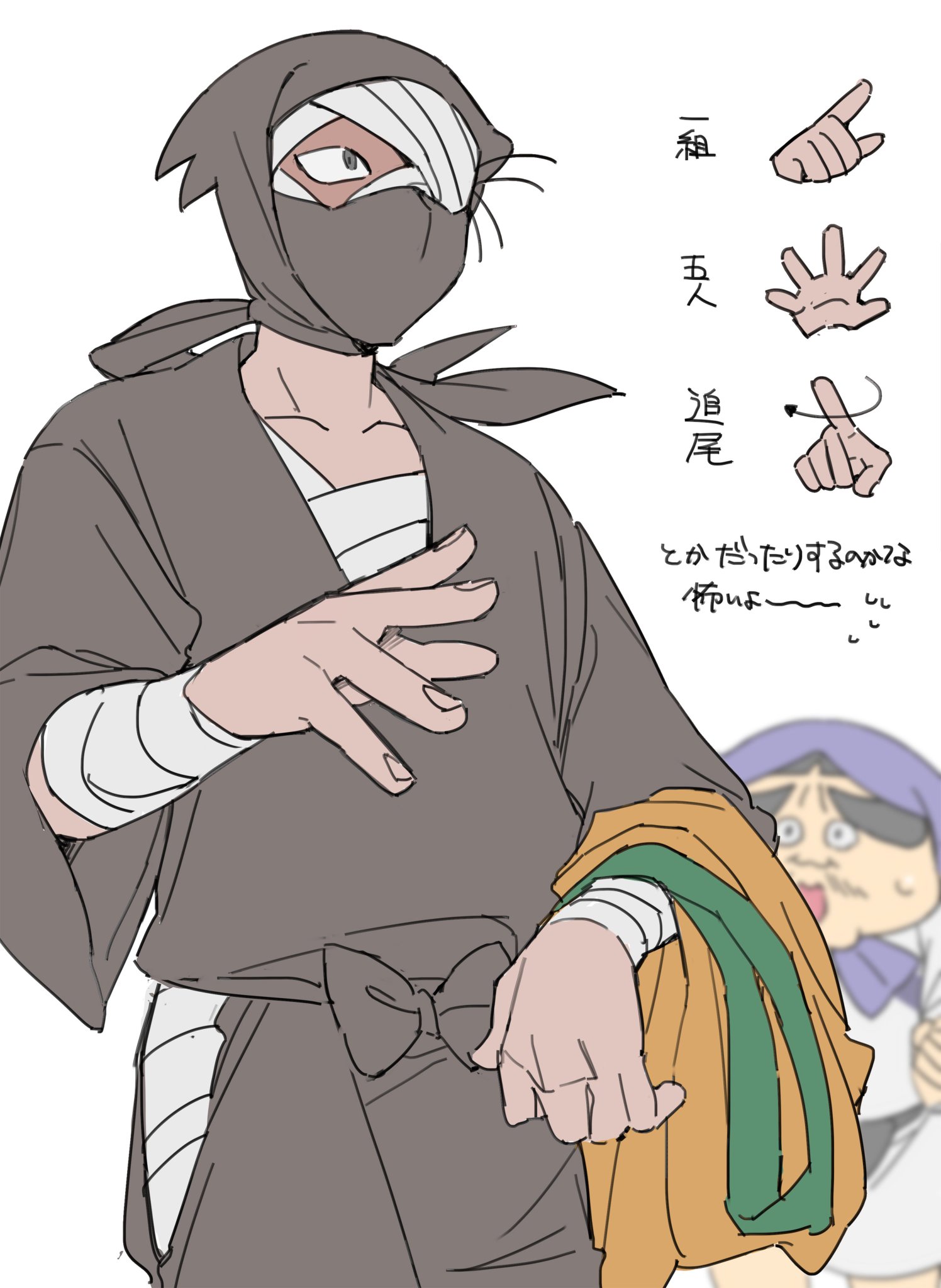 在推特上看到網友解說「劇場版.全員出動」中,亂太郎一行人跟蹤大間賀時城主被雜渡發現後,雜渡給手下的暗號:(一組人馬、五個人、跟蹤他們)
