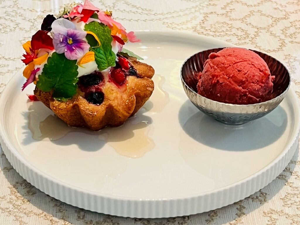 幫媽媽點的特殊擺盤甜點,上面的花草可以食用,然後服務人員還會淋上接骨木醬,旁邊搭配玫瑰風味冰淇淋......但老實說這些花草吃起來會苦耶