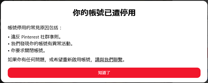 半夜突然發現圖釘帳號被封鎖 我會崩潰欸