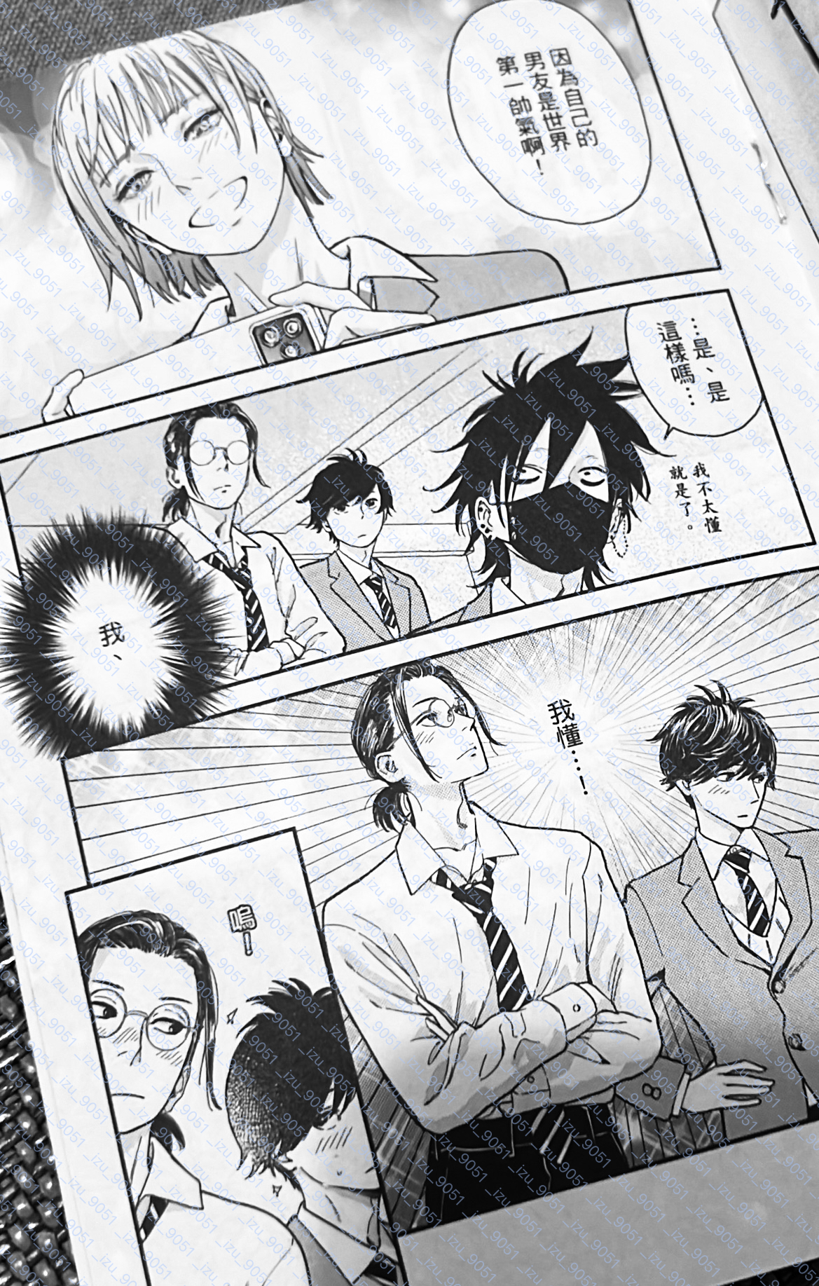 分享個長鏡頭1小冊子我很喜歡的一頁(浮水印是我哀居帳號,懶得改ㄌ )真的好喜歡二年生的互動,真央跟義一兩人共感詩音的話真的大爆笑 殘影時真央好像就有共感(屁股跟腰這方面⋯⋯?),到Long take 1裡確切知道仁義兩人交往後的反應,萌萌的