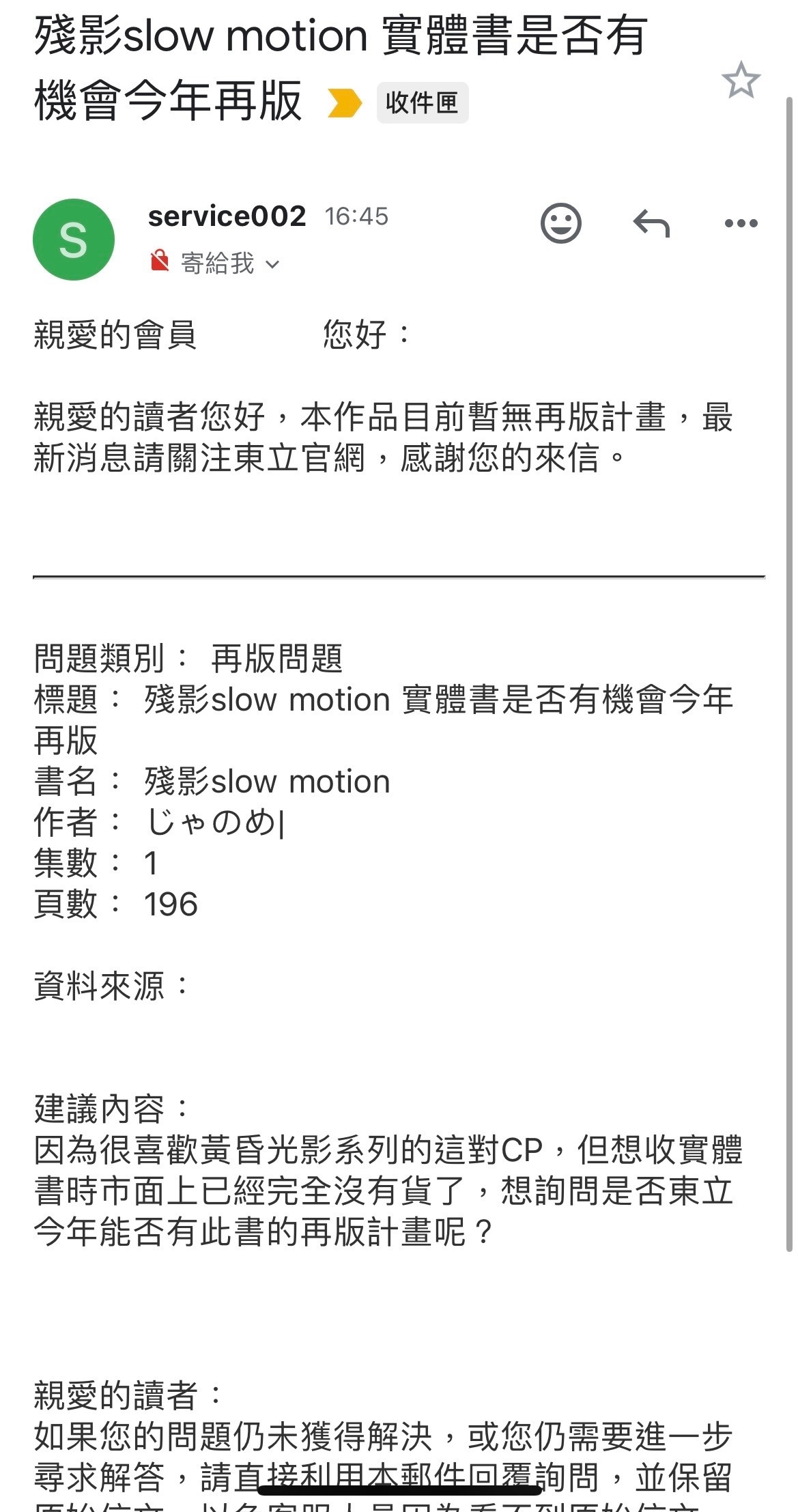 雖然最近最崩潰的是臺版前三冊真的找不到 最想收的殘影slow motion目前也沒有再版計劃,我跑去看了東立客服希望能再版的聲音真的好多好多,請東立把拔看看我們黃昏光影吧 好像除了動畫剛結束那時候有再版外就都一直再版取消了(崩潰.jpg)我真的很需要那三本酷東西⋯⋯