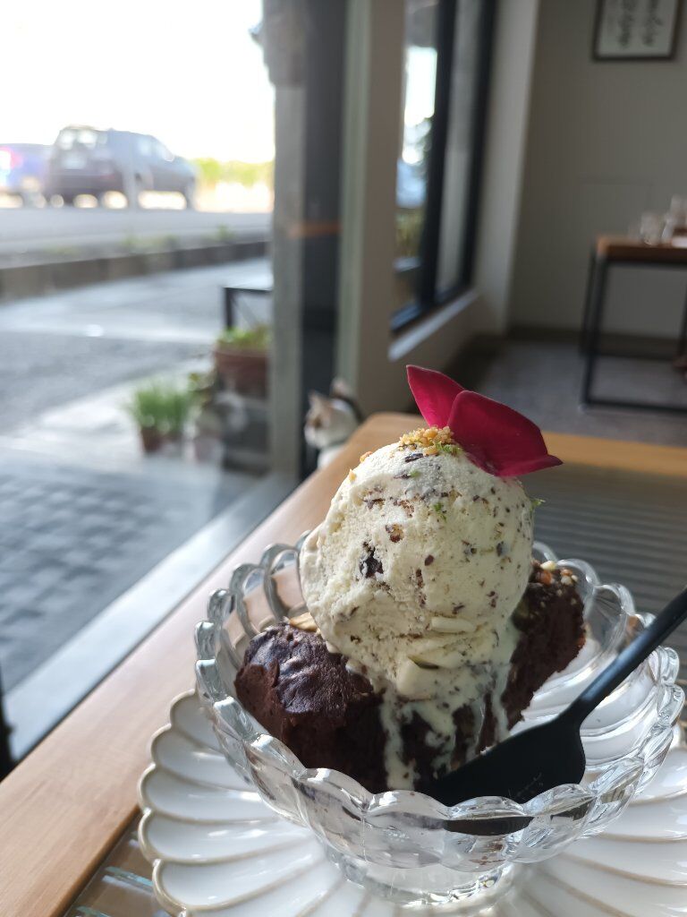 布朗尼冰淇淋的玫瑰花瓣看起來好像蝴蝶(後面有店貓),布朗尼有堅果似乎還有果乾,冰淇淋也有些巧克力碎碎,好吃。
