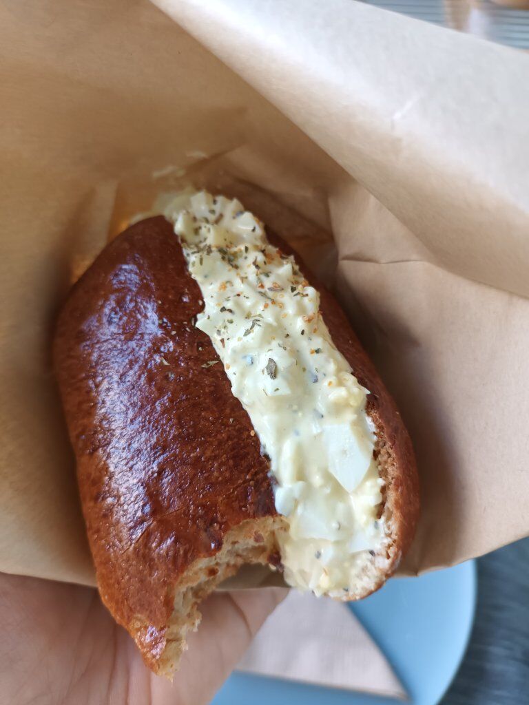 蛋沙拉堡的麵包體是甜麵包,大約一個手掌大,好吃。