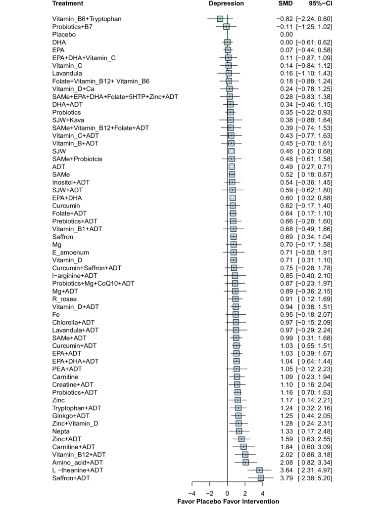 The largest summary of supplements for depression. Saffron had the largest decrease in depressive symptoms.