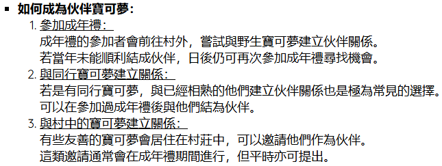 您好,只要角色參加過成年禮,就可以與同行寶可夢成為伙伴。已經在【寶可夢守則】新增更詳細的文字敘述,感謝提問!