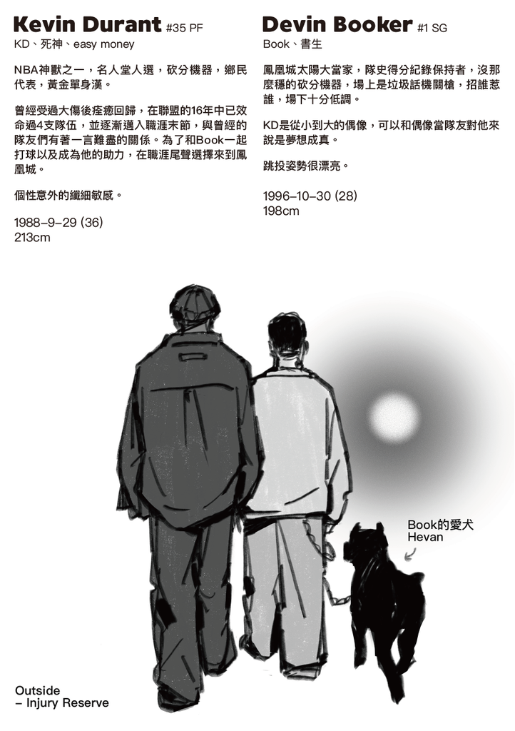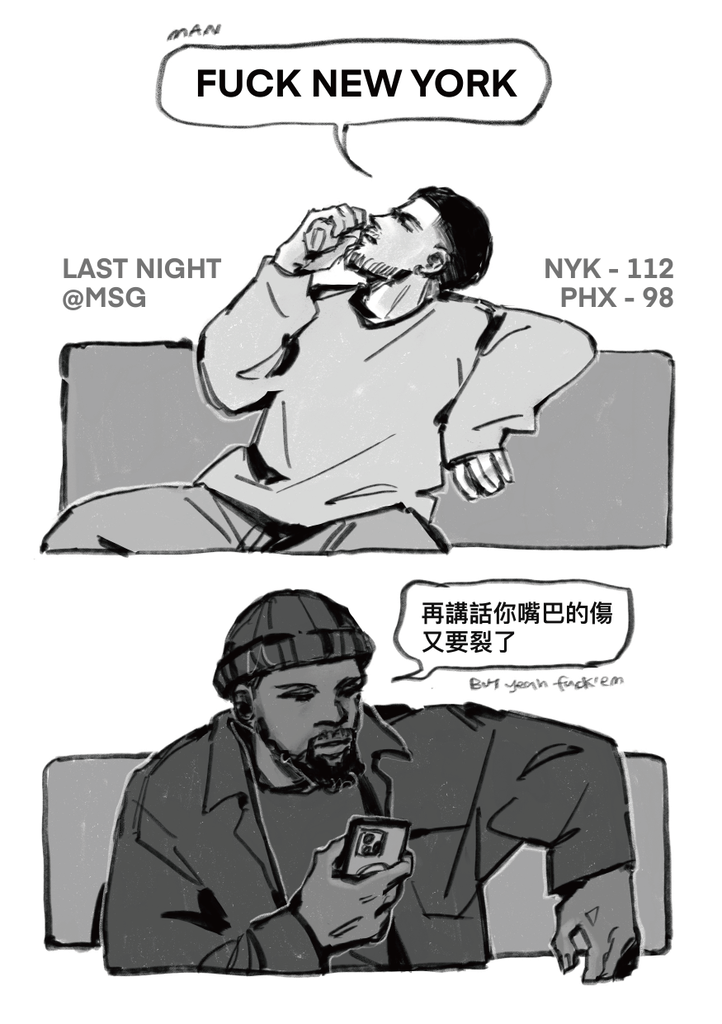 前情提要本無料其實是在今年交易截止前,希望可以讓KD留在太陽的祭品,結果留下來了but at what cost...🥲 總之短漫的背景就是在今年在MSG輸給紐約尼克的隔日回到了鳳凰城,基本上就是我在消費自己的主隊,Book嘴巴會受傷就是在對尼克的時候吃了我們家哈特一個手肘居然還沒被吹,躺在地上一陣子還得起來回防OG...(真抱歉)賽後嘴巴還看起來腫起來了