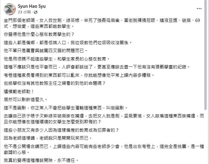 考題出現捅屁眼、精液豆漿!金門績優師請假了 校方:已進入調查 | ETtoday社會新聞 | ETtod...