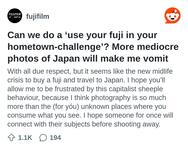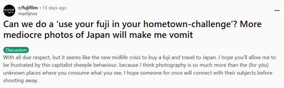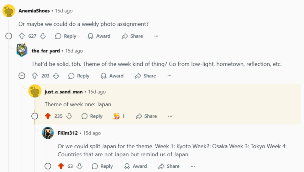 之前在Reddit 的富士版看到有人在靠北拿富ˇ士相機一定要去日本拍照的風氣很噁, 怎麼不拍自己的日常之類的, 就有人回覆說不然我們可以訂每週主題啊