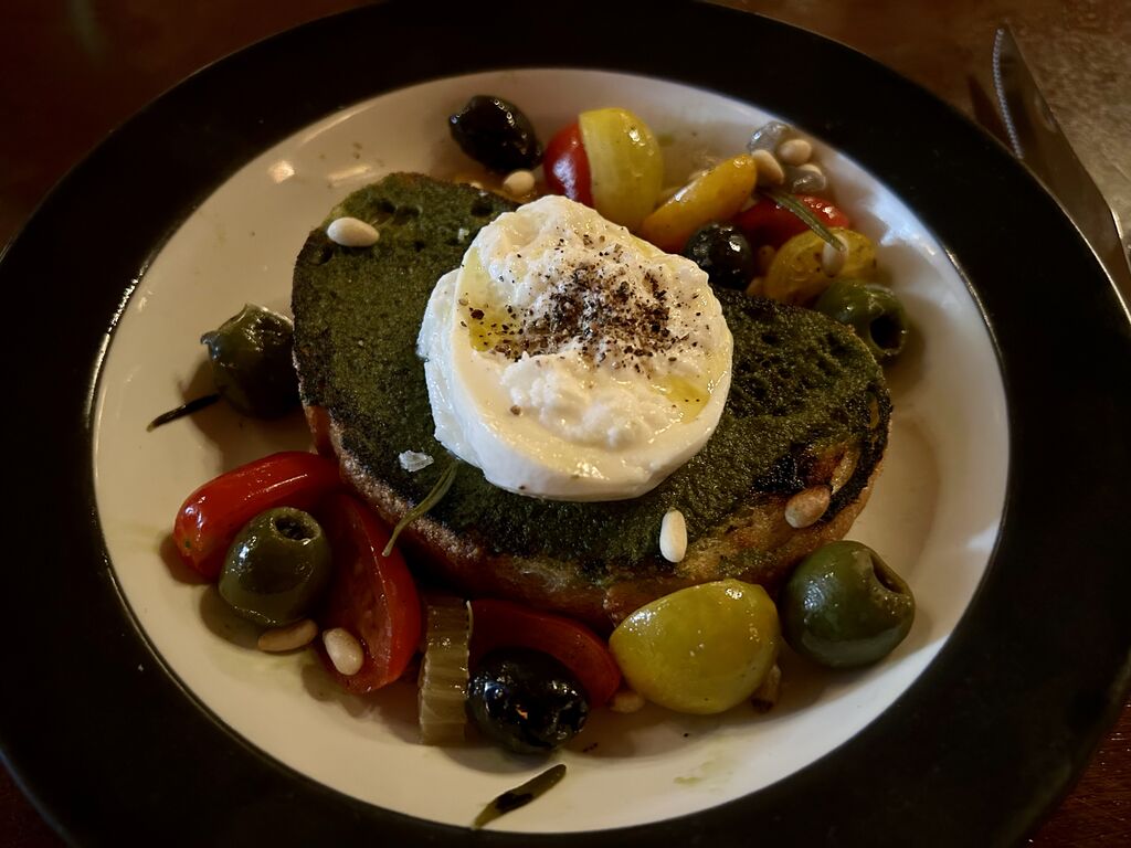這道布拉塔起司沙拉的重點其實是布拉塔喇底下沾了青醬的麵包片!