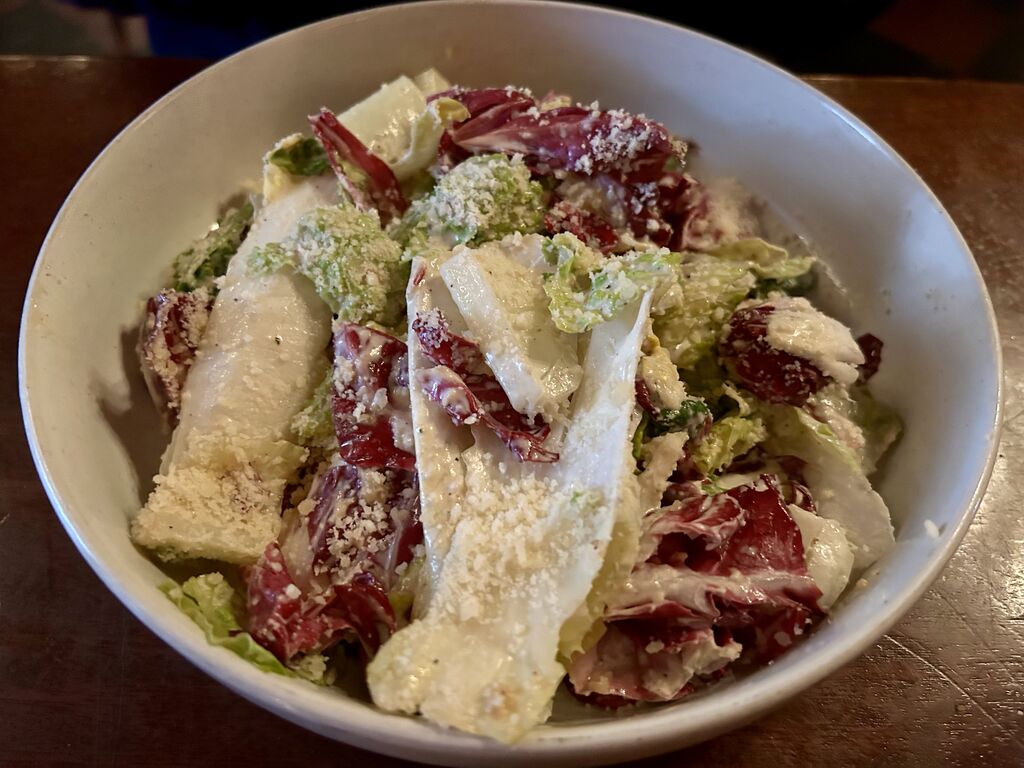 然後這道義大利風的凱撒沙拉,真的好吃啊,跟一般的凱撒沙拉不同。凱撒沙拉其實是加州菜,但是這道首先生菜是用有微妙苦味的義大利紅高麗菜 raddicio跟苦苣 endive,就比淡而無味的蘿蔓生菜高明了!然後醬汁感覺重點是義大利帕瑪森乳酪,真的好香啊,鯷魚跟檸檬只是畫龍點睛而已。我其實覺得帕瑪森乳酪有種肉味,很好吃!
