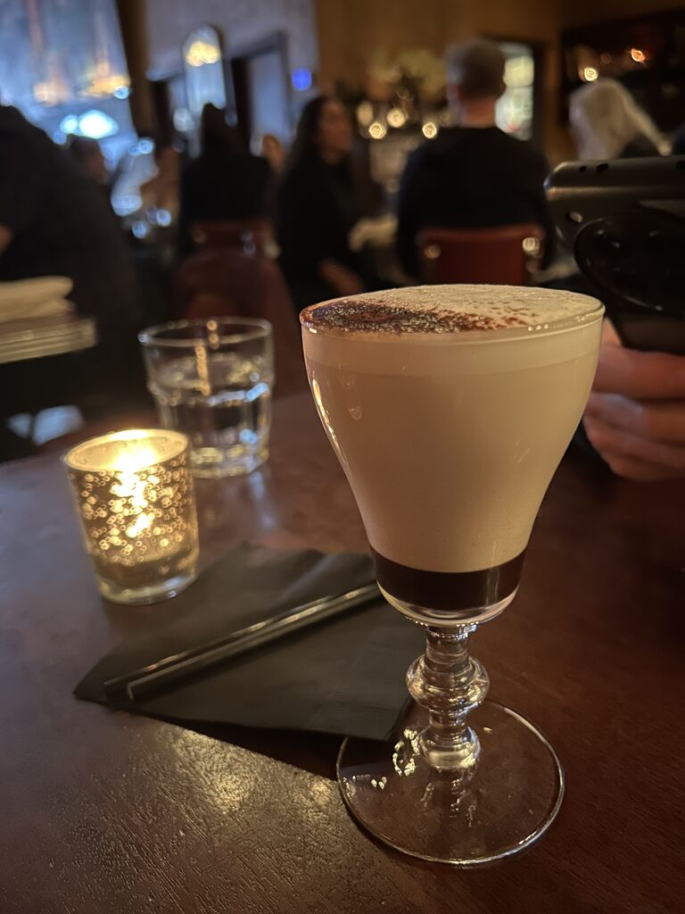 跟甜點一起上來的是餐廳的招牌餐後酒「卡布奇諾」,這當然不是卡布奇諾,而是威士忌、干邑、熱巧克力跟熱牛奶調成的雞尾酒!是在1920年代美國禁酒令時流傳下來的食譜,這樣也一百年了!雖然很烈,但是據S說非常順口,他一下就喝光了!