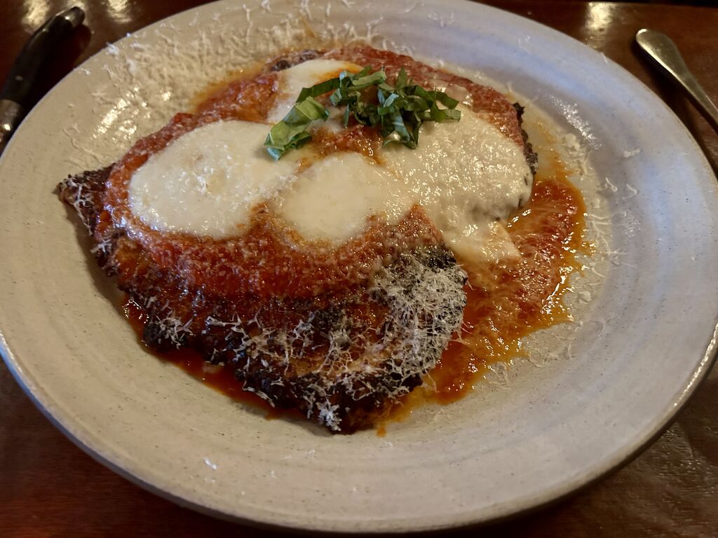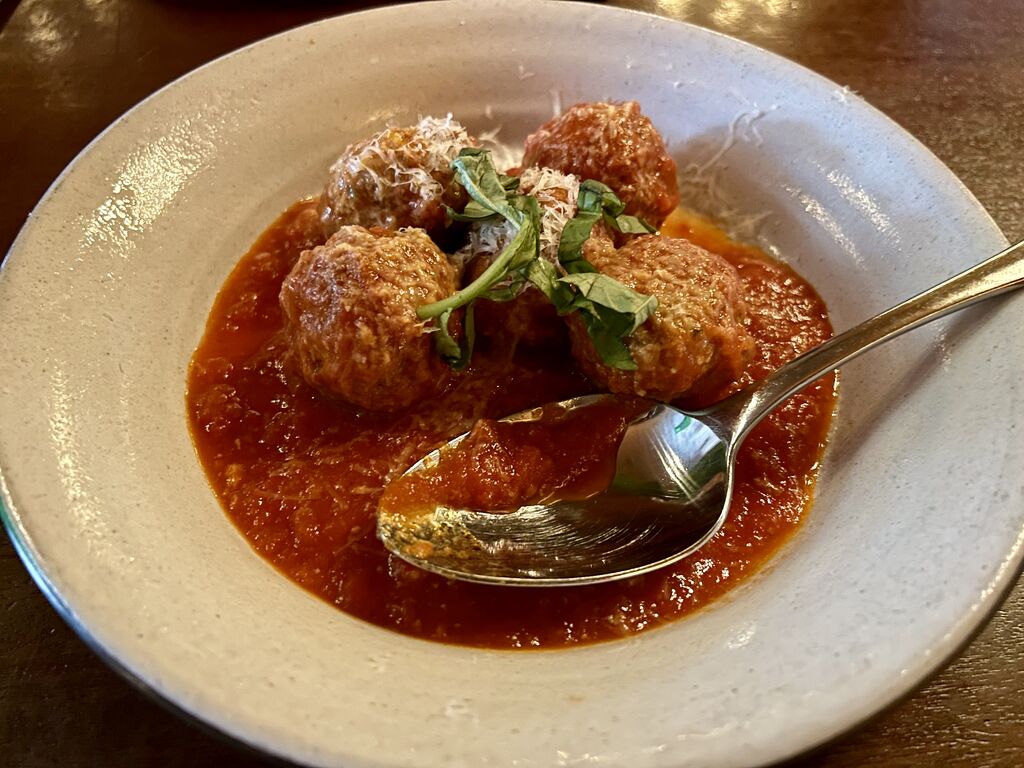 外表看起來是普通的義大利肉丸子,但是真的比別的地方的好吃。首先肉丸是牛肉豬肉混合,跟一般義大利豬肉丸子比多了一層風味,裡面有稍稍辣味跟某種神秘的香料味,剛好平衡了肉丸子的味道。其實一般義大利肉丸子都有點油,美國的義大利菜更是所有食材都在滿滿的油裡載浮載沉⋯⋯