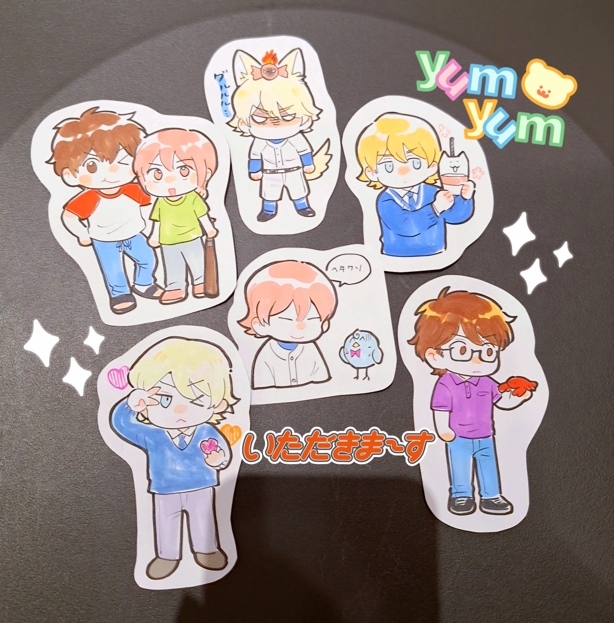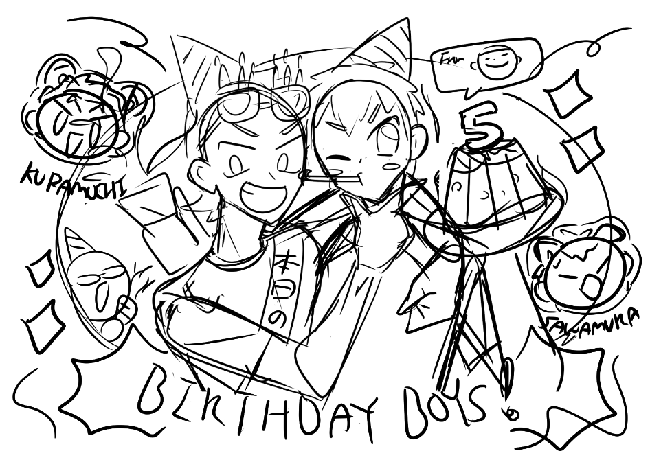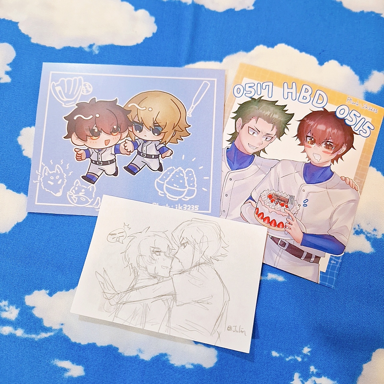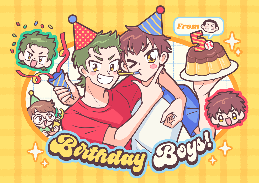 商店街活動的明信片畫了倉持+澤村生日賀圖(feat.5號室增子學長淺田學弟), 當時很想畫畫獵豹大人和增子學長送大布丁而且剛好應景到活動當天是倉持生日