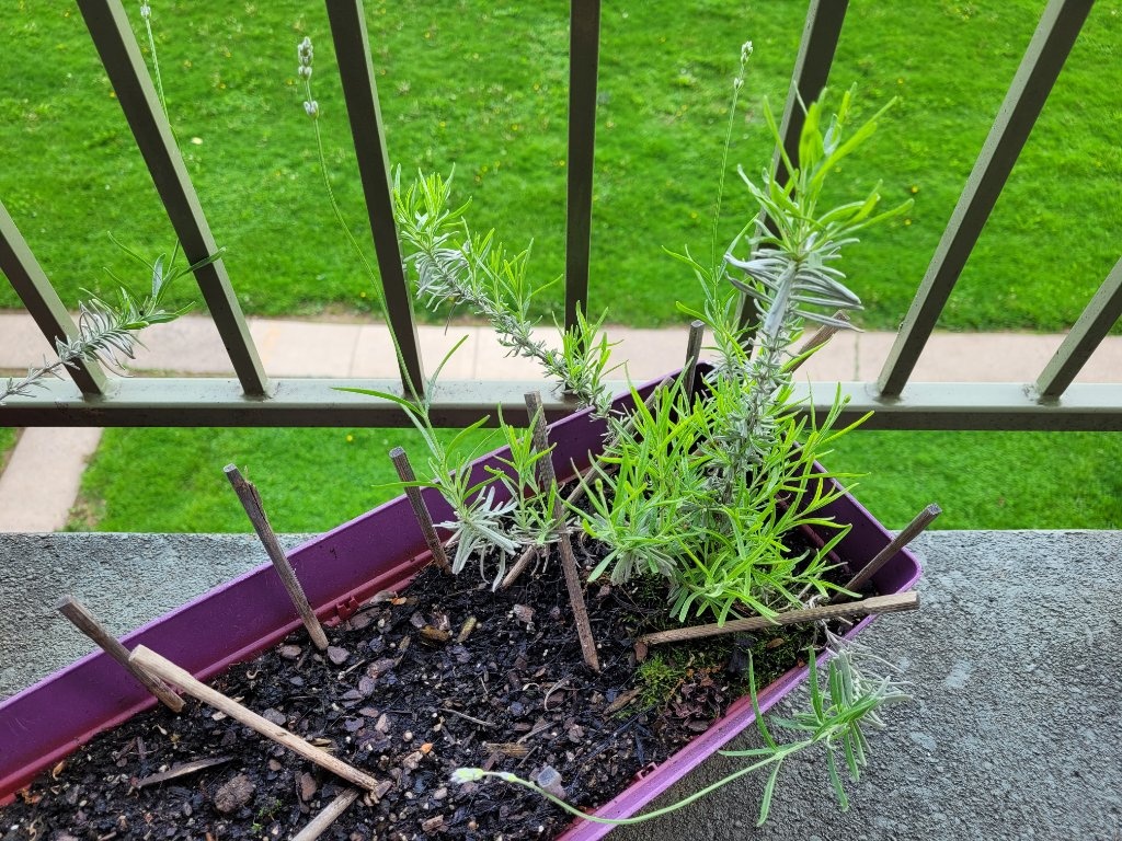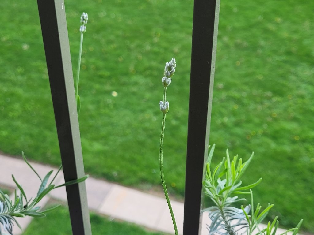 然後是現在一枝獨秀的英國薰衣草。嗚嗚嗚,它長花苞了......不愧是成熟天數需要九十到兩百天的植物。我是去年三月左右在市內播種育苗的,歷經不斷的猝倒、無理由的掛點,春天霜期過後移到陽臺盆栽裡,很幸運它足夠勇健,又靠自己撐過了整個冬天,現在終於要準備開花了......