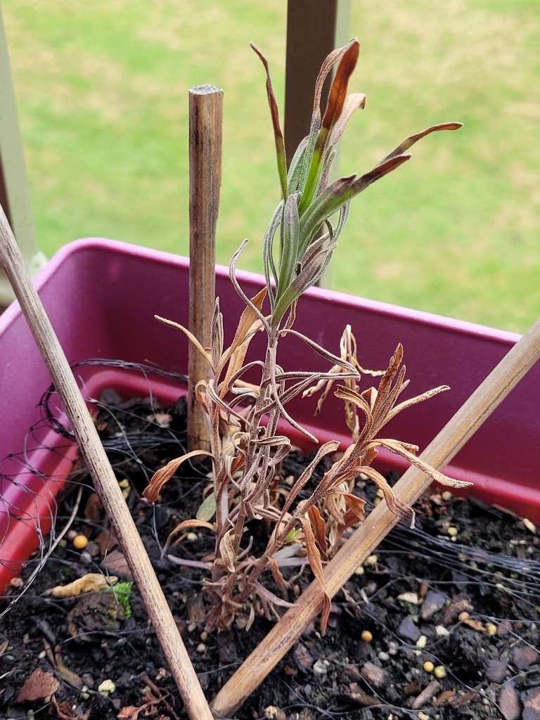 有兩株是去年入冬前,最長的枝條就超過五吋,像左邊這張照片那樣,右圖則是那株比較弱小的,只有三四吋左右。我一直以為這一株應該保不住,但是仔細看會發現它有抽綠色的小芽。