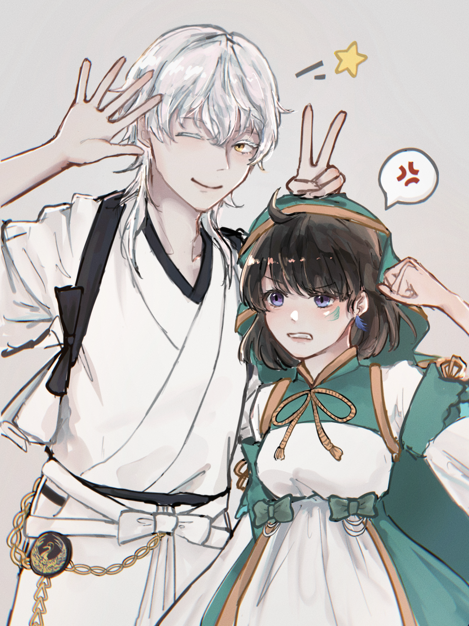 鶴丸見狀先是露出震驚的表情,然後比出像是提示的三個手勢——攤開的手掌、食指與中指組成的萬用拍照手勢、收起所有手指的拳頭。