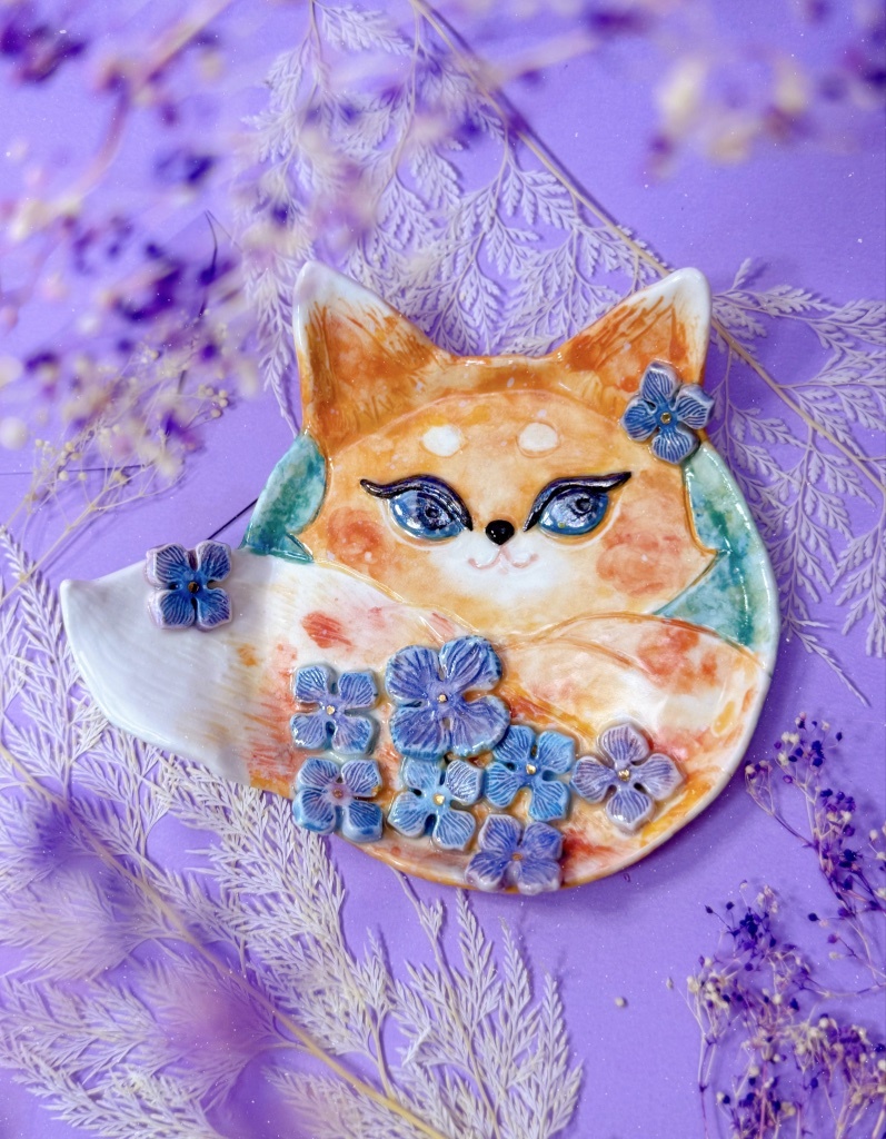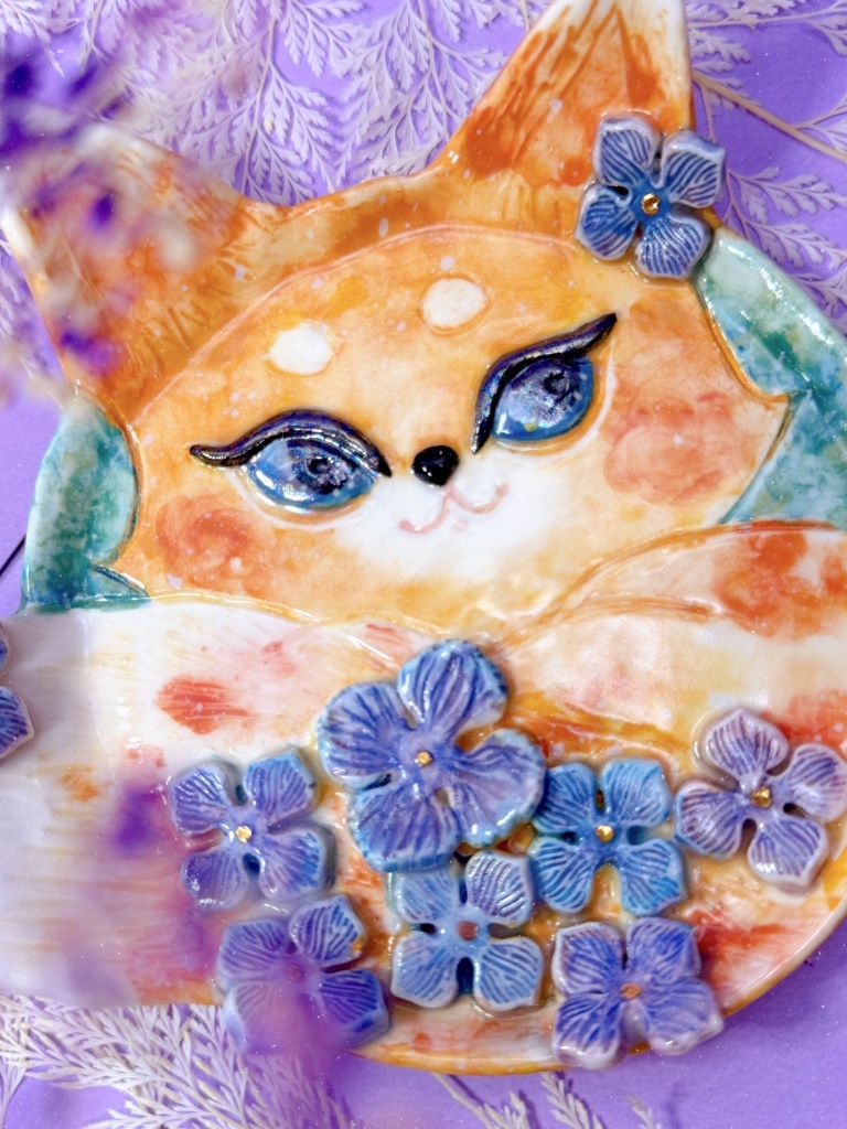 這是我最近完成的作品〈藍眼狐狸與繡球花-手作瓷雕盤〉。