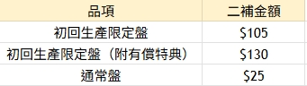 各品項二補金額