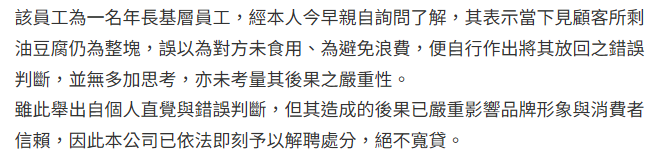 餐飲業的話,如果那員工後來爆料都是老闆說不要把看起來完整的食物丟掉,要我們回滷就能重新上,我也不覺得意外