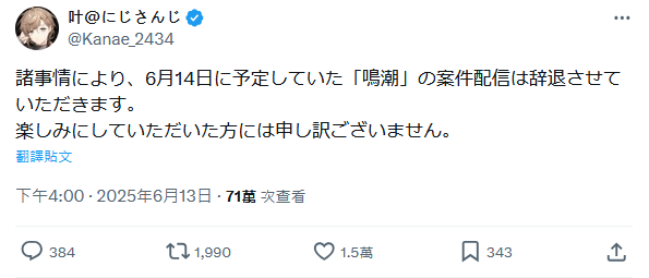 鳴潮直播取消和性騷擾炎上有關嗎