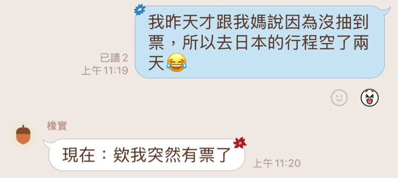 : 謝謝ㄇㄗ!!我也覺得很難搶所以超級不抱希望,想說反正有時間就來試試看好了,結果真的買到票了⋯⋯