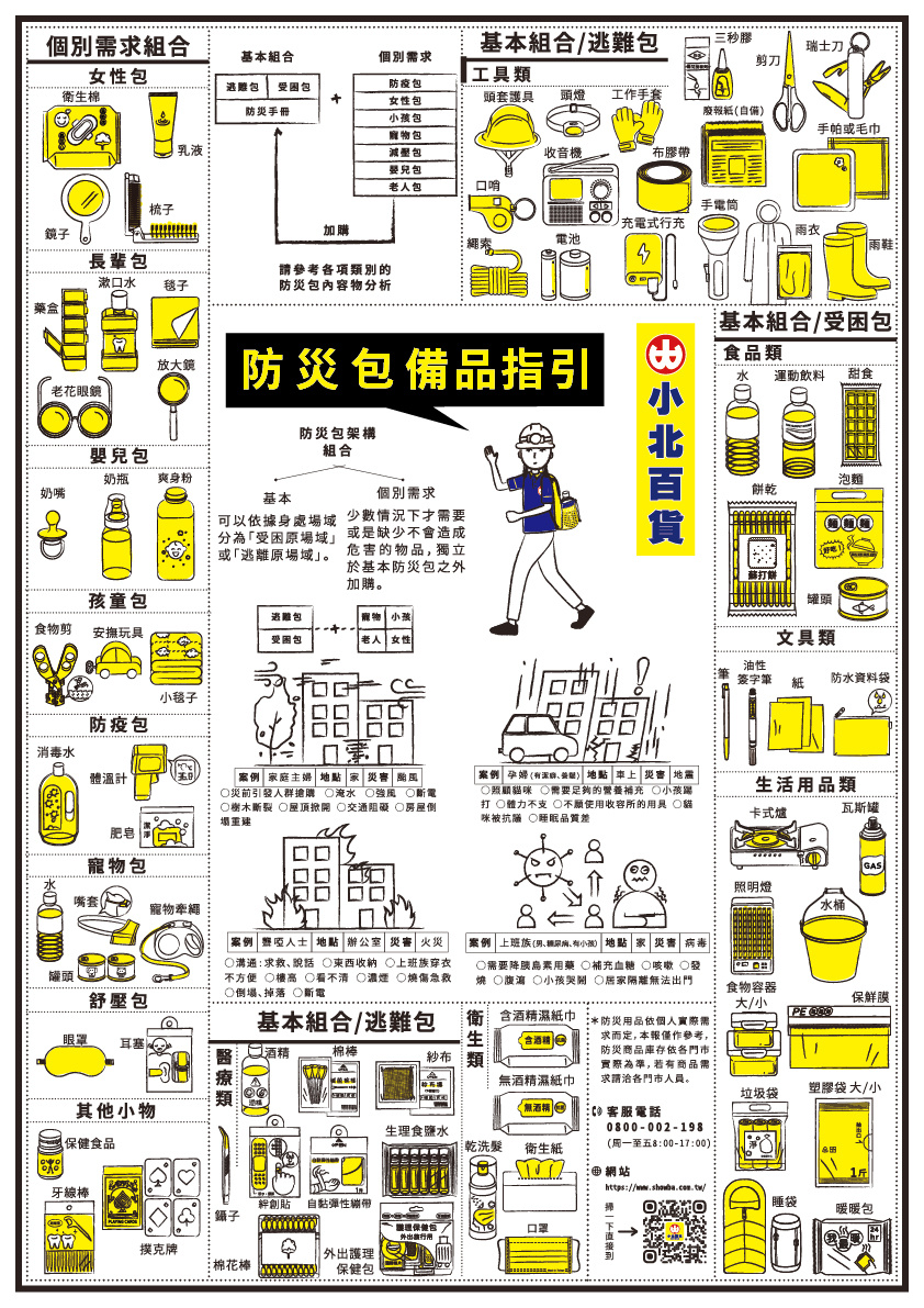 現在想到的就是水和食物、藥品、衛生紙濕紙巾乾洗手衛生棉條、收音機手電筒和電池、行動電源、瑞士小刀、證件影本、小電風扇,太陽能充電板好像也需要?上網看一下也不貴。