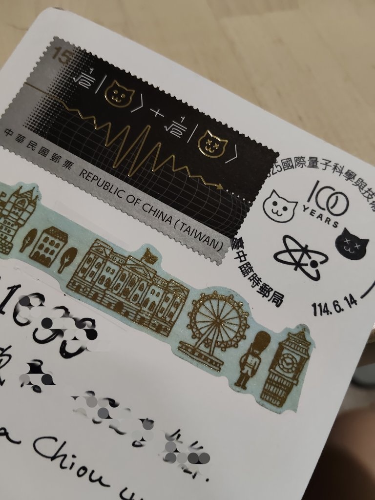 不太會裝飾明信片,就把小全張紙邊的量子百年紀念剪貼上去,郵局也幫我把蓋戳了