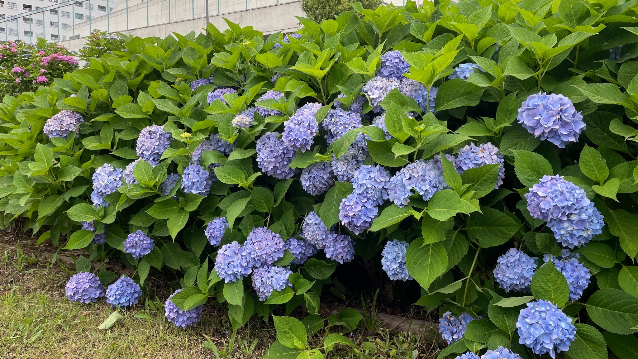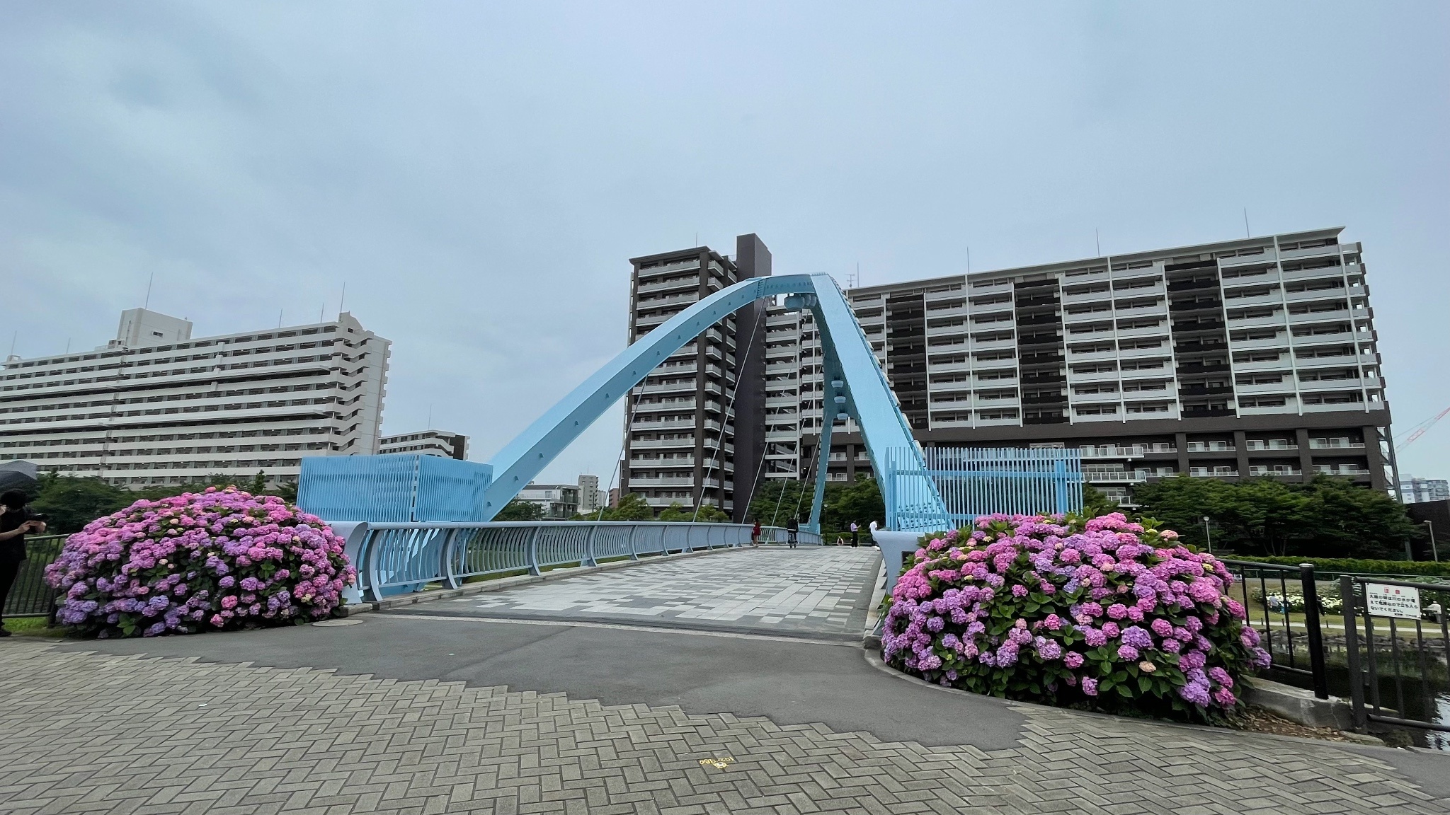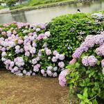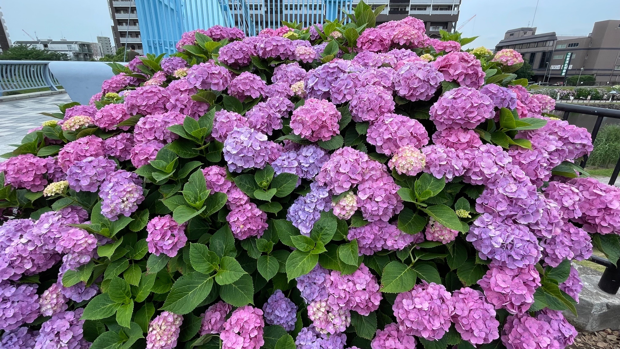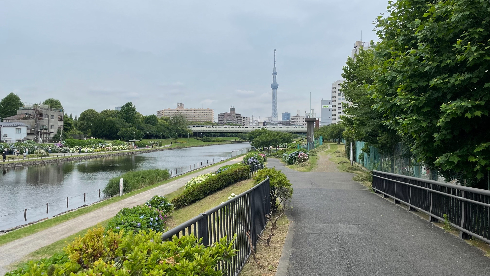 紫陽花開滿一整條河提邊,還可以看到晴空塔