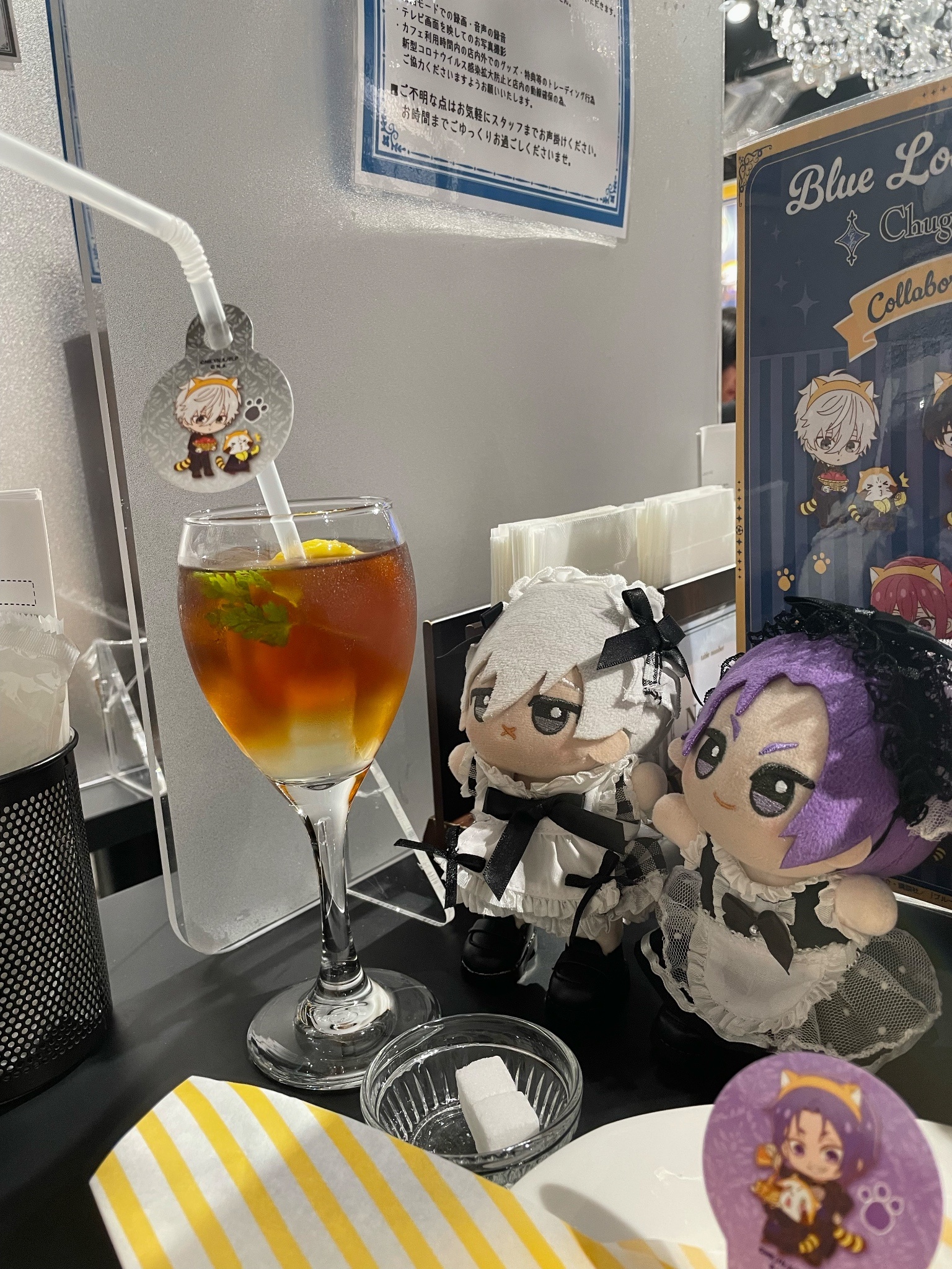 沒多久店員就廣播我的號碼去結帳買週邊了,買完週邊回來之後,東西還放在腿上,一邊把玲餐點附的那杯湯移到左邊,一邊想剛剛兩張杯墊又是抽到兄弟,要再來拍一下