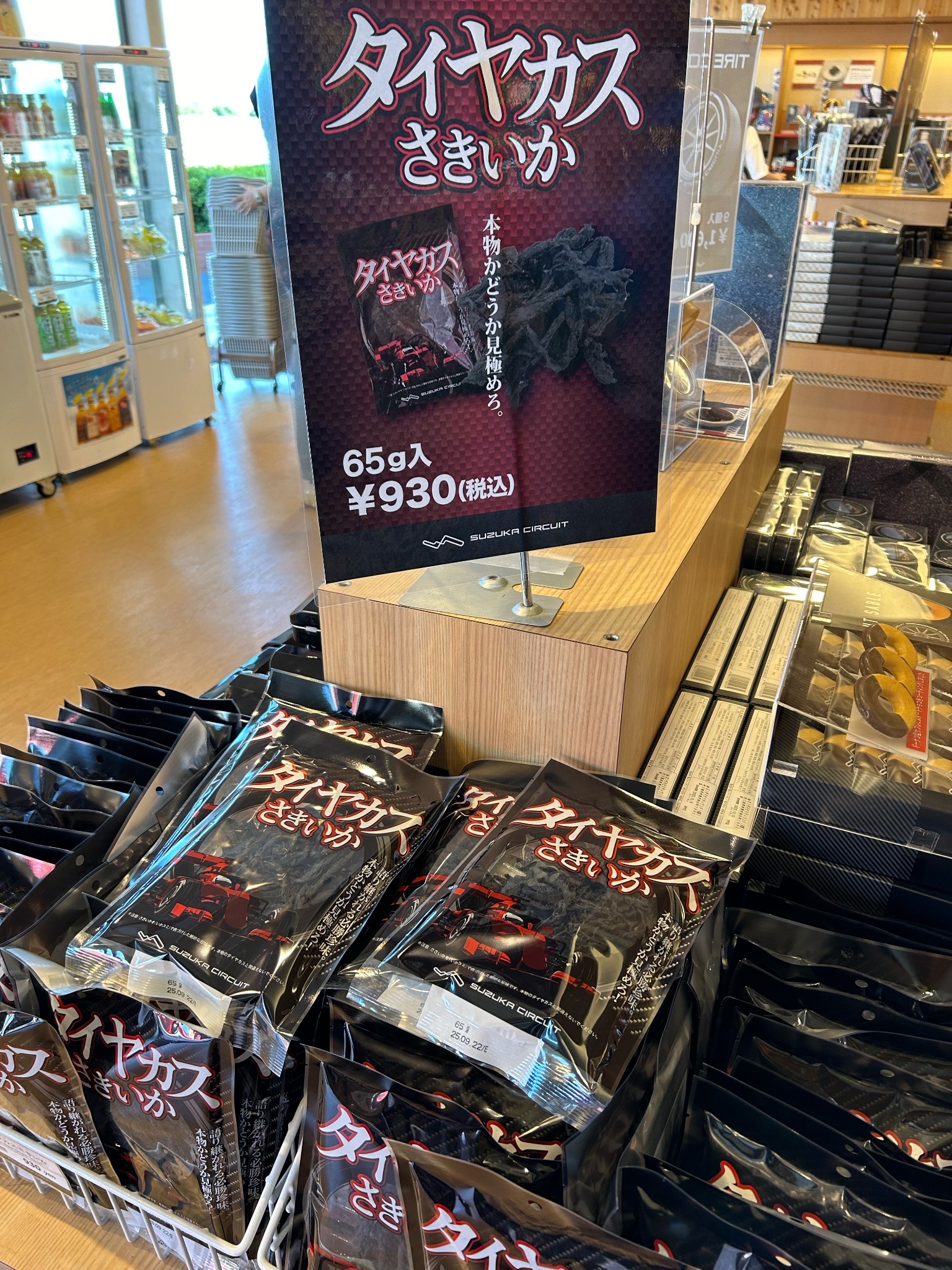 賽道名產輪胎皮(賽車車胎升溫融化混合塵土或其他東西後掉落下來的殘骸)魷魚絲,超想吃但65克930日幣,對不起我赤貧