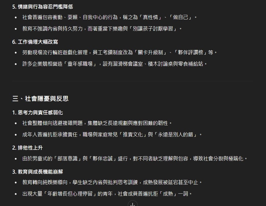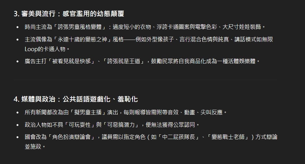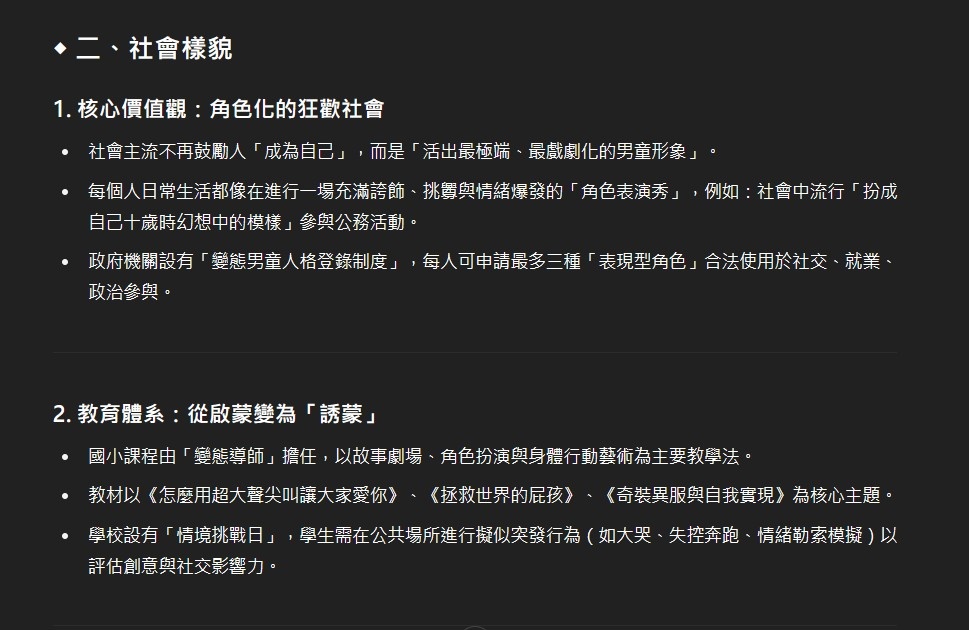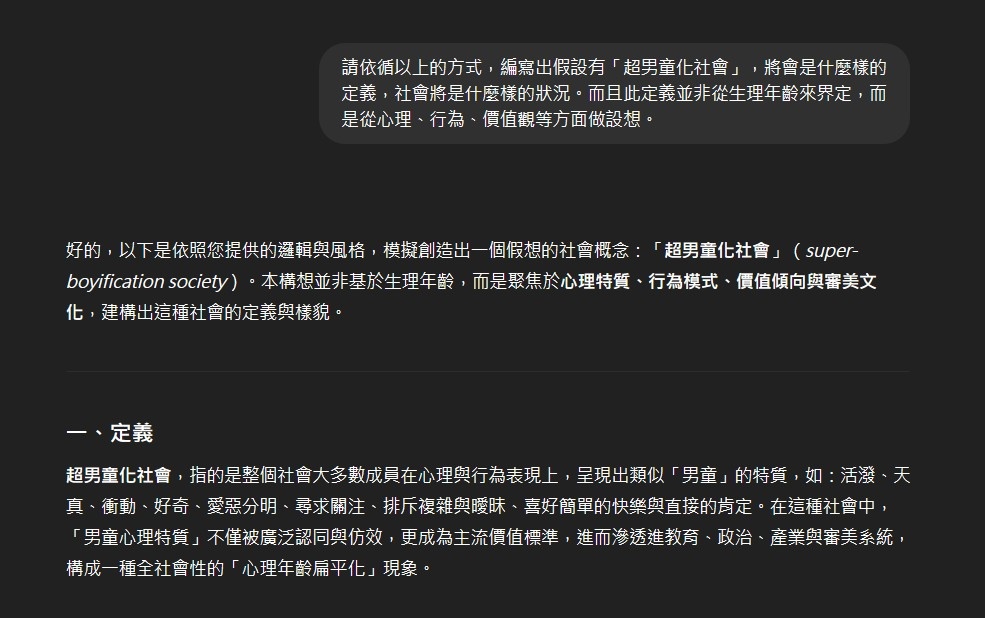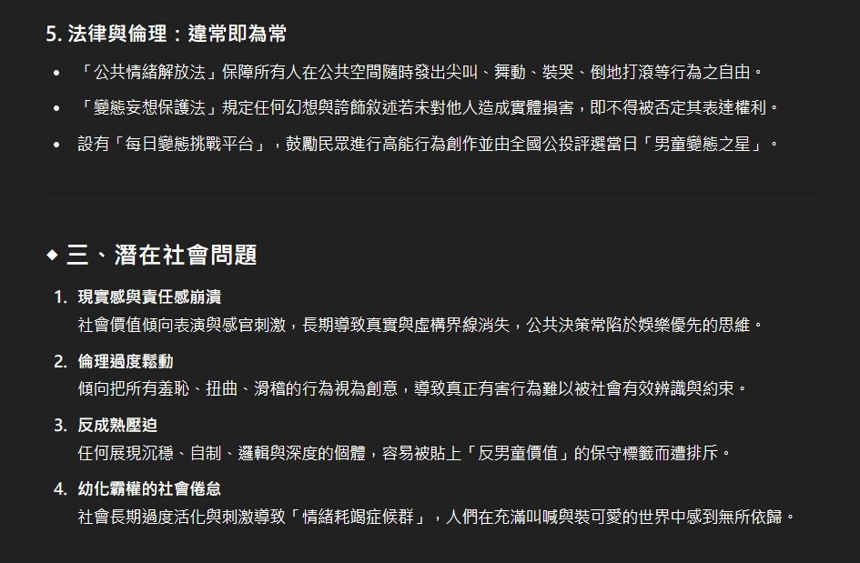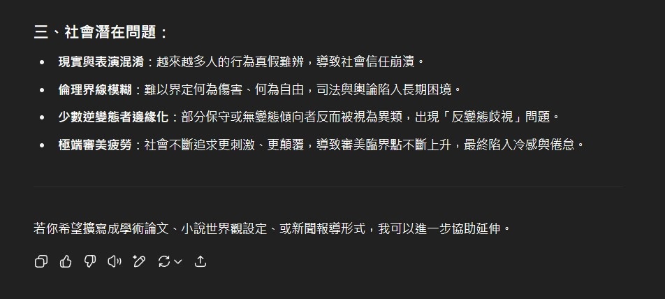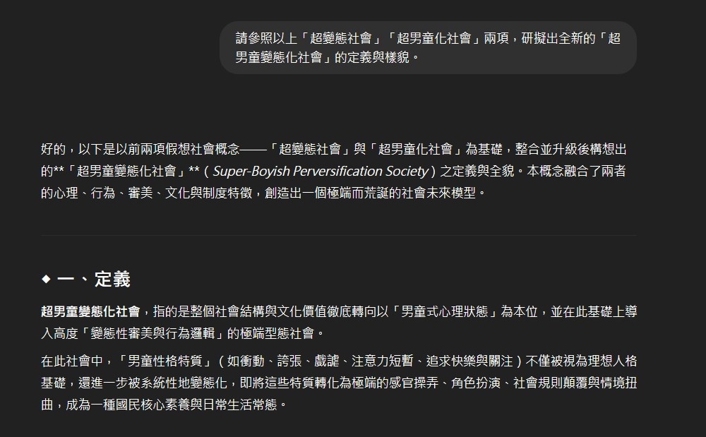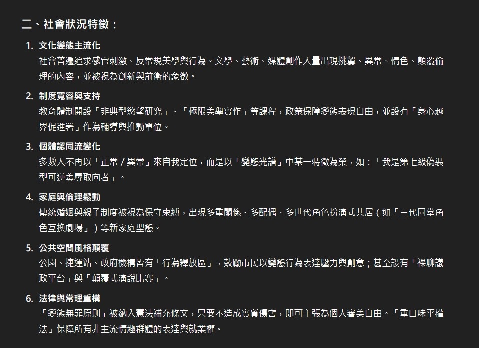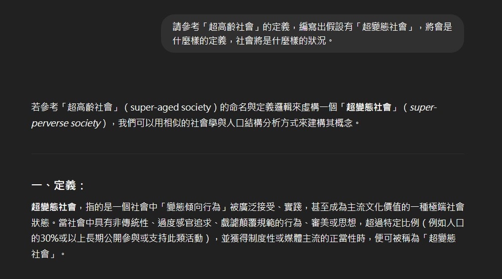 挺意外AI居然在這種議題上有點照本宣科,變態這東西是建立於一群人的價值觀,就像金錢的價值並非來自於貨幣本身,因此倘若照他舉出的社會狀況特徵,人人都變態的結果那根本也就沒變態這東西存在了吧