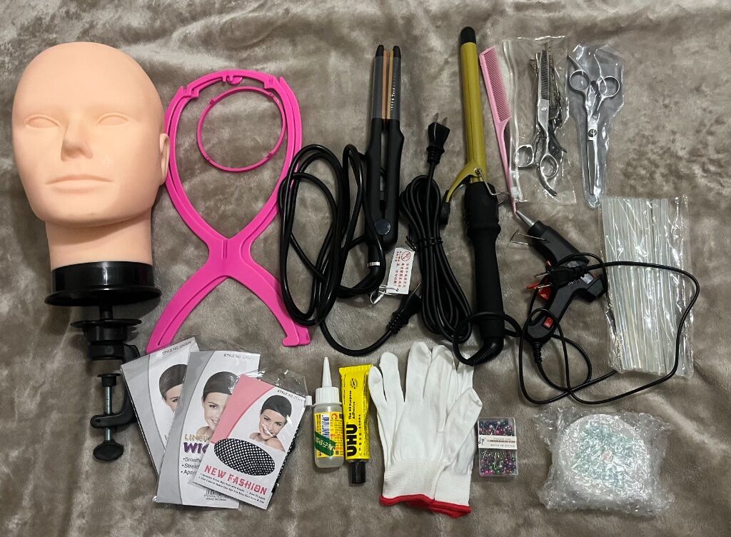 假人頭+支架、大頭針、電捲棒、玉米鬚夾、熱融膠、髮蠟、打薄剪、剪刀