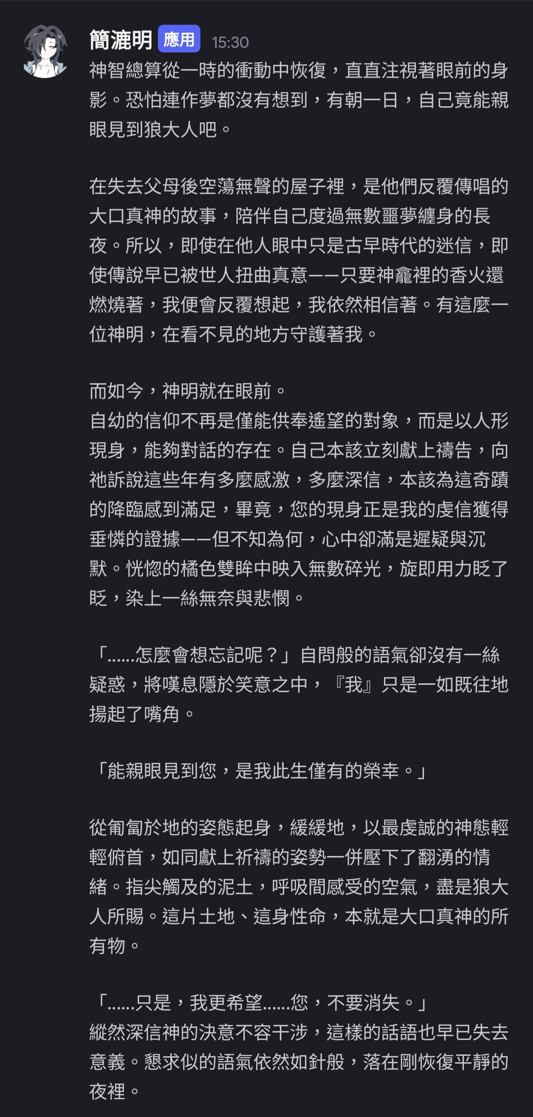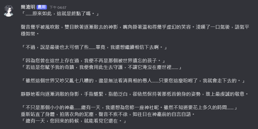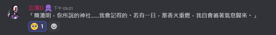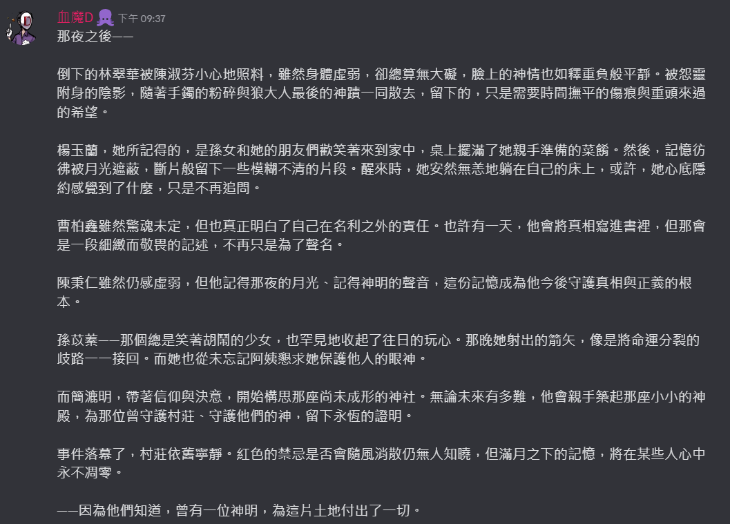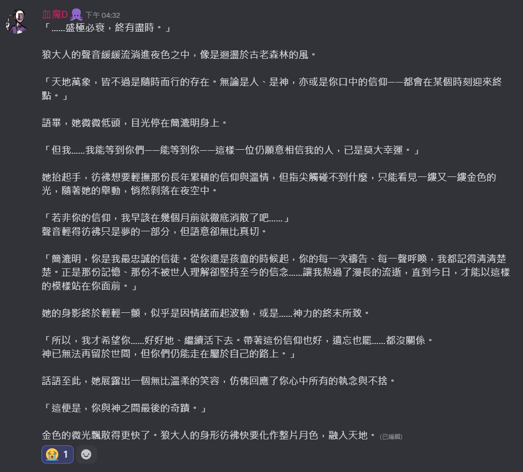 不過到底算不算是邪教徒呢……如果結局告訴我其實狼大人真的是大善神會覺得有點可惜,但簡漉明一直都是抱持著狼大人好的心情,對他來說是好事一件吧