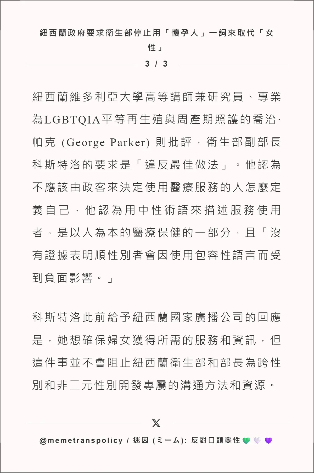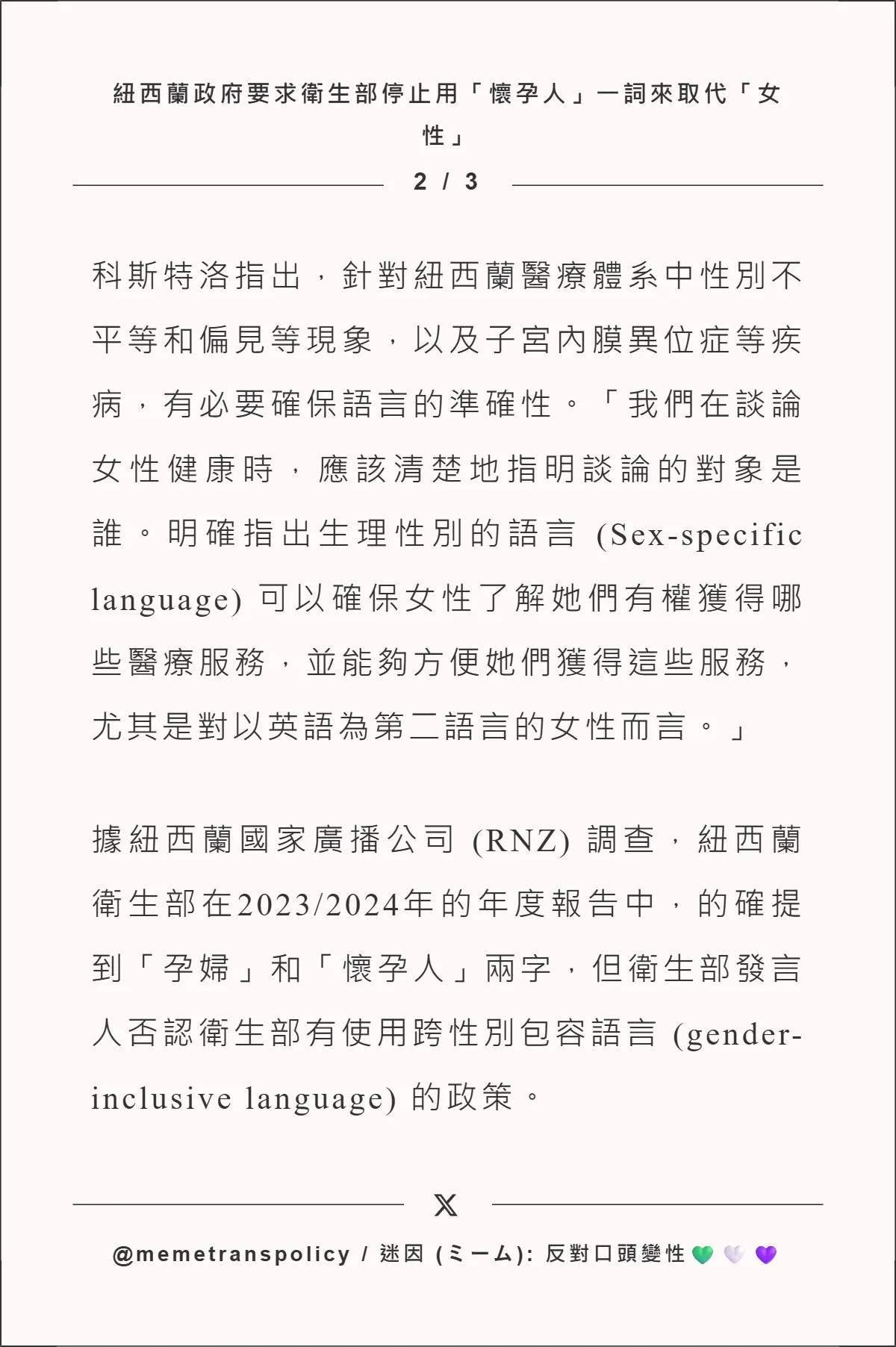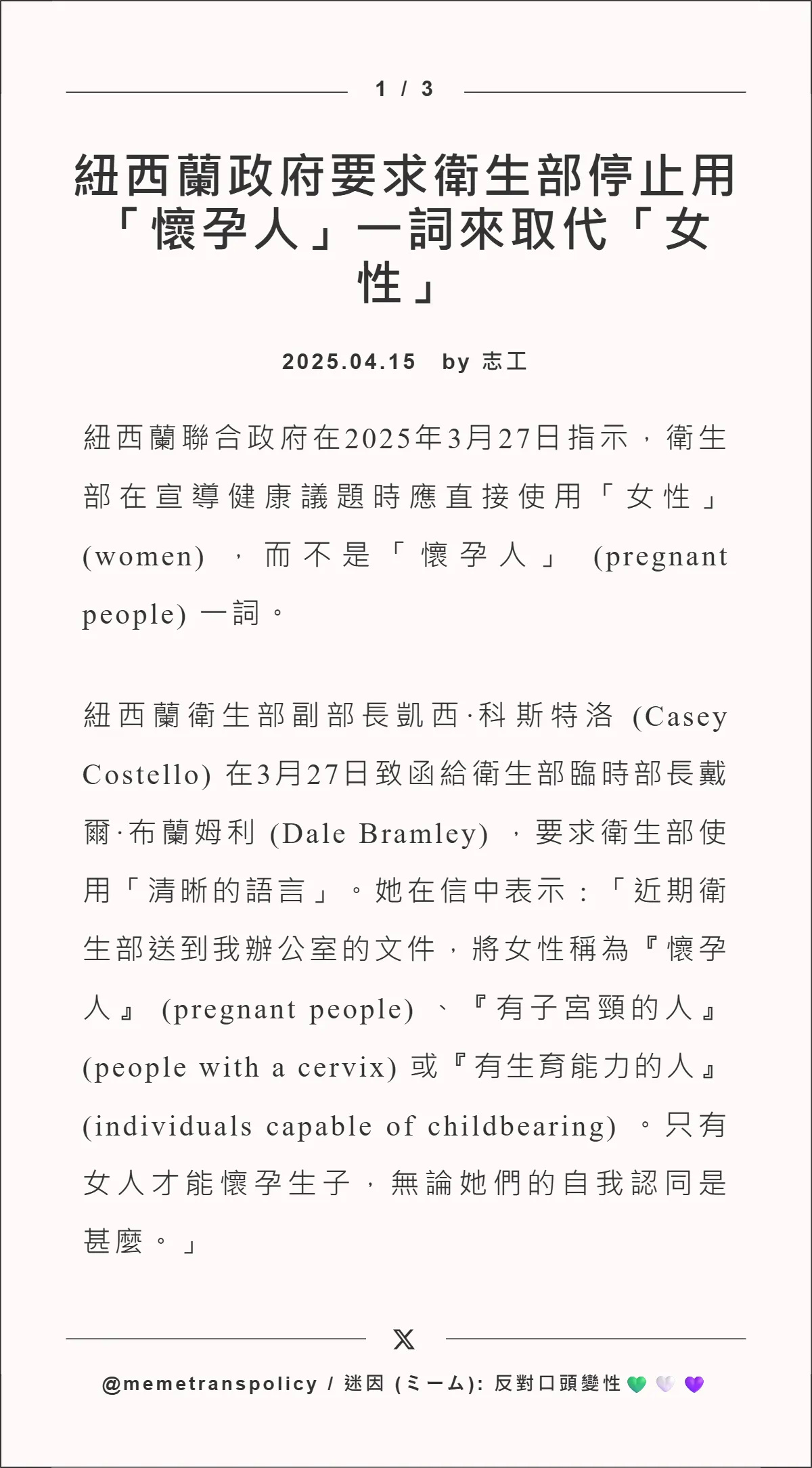 紐西蘭政府要求衛生部停止用「懷孕人」一詞來取代「女性」 | No Self ID Taiwan 反對自我...