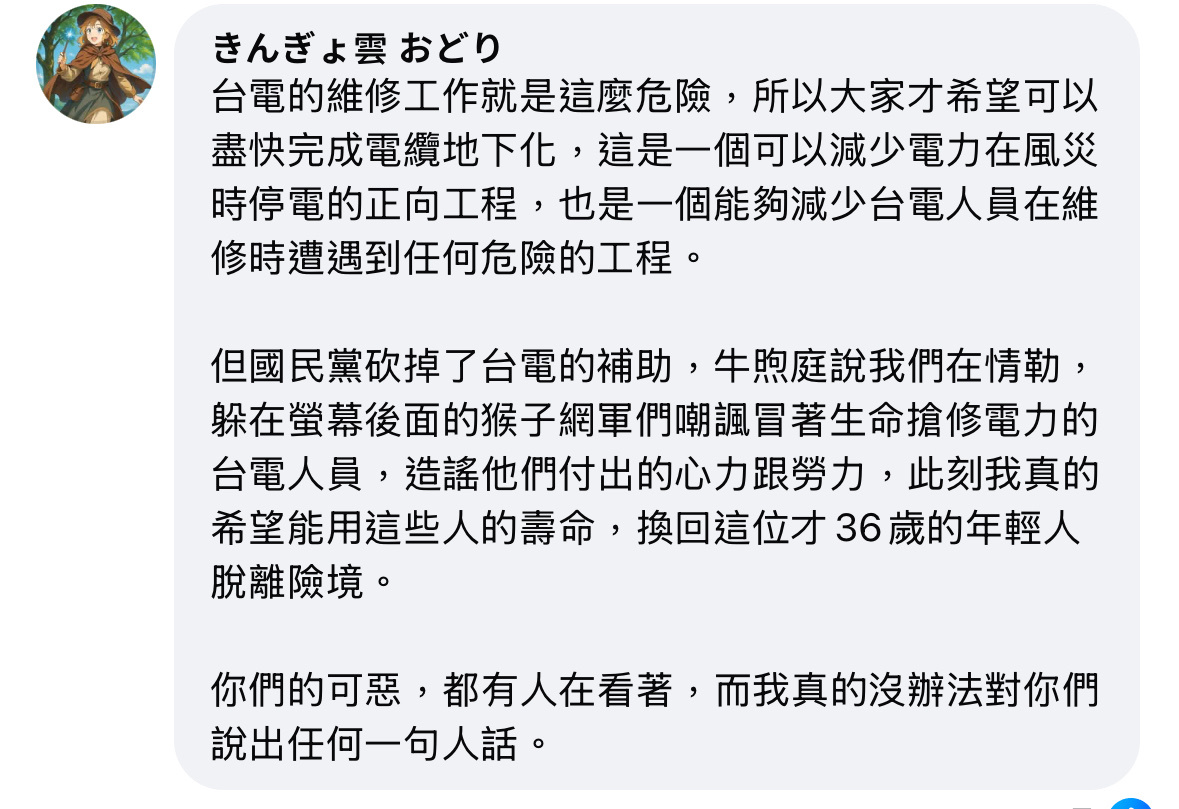 跟電有關的工作都很危險,時間拖越久,風險越高,臺電馬上搶修的原因